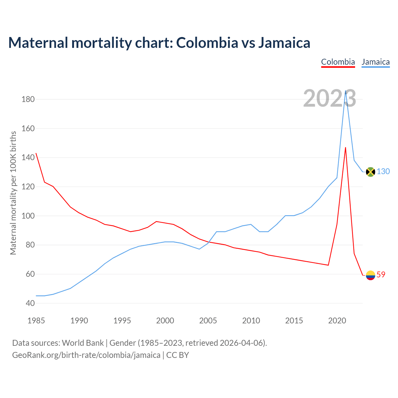 The maternal mortality rate, which is the probability of dying during childbirth or within 42 days of pregnancy termination, is 59 deaths per 100,000 live births in Colombia, compared to 130 deaths in Jamaica.