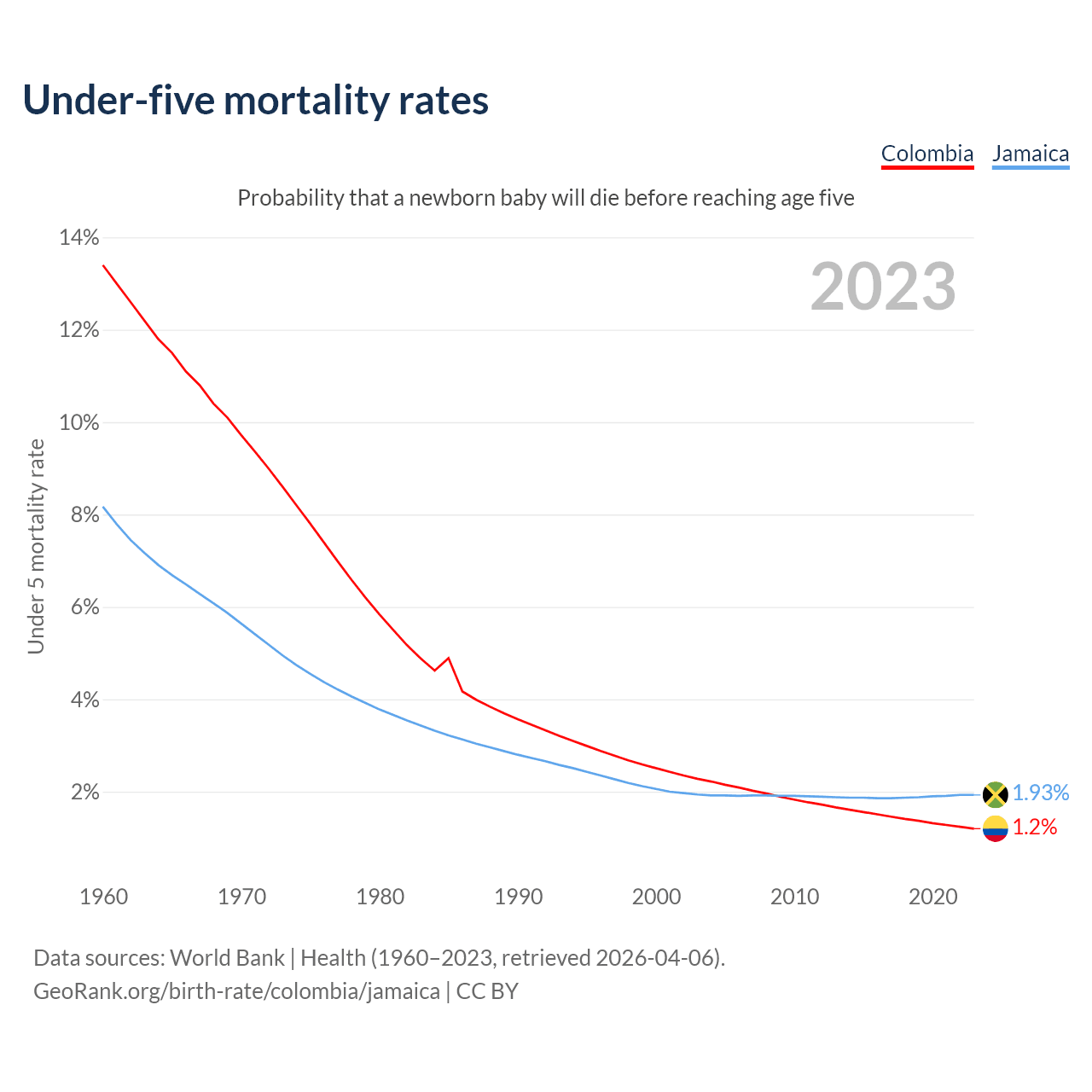 The chance that a newborn baby will die before reaching age five is 1.2% in Colombia and 1.93% in Jamaica. Above is a chart with historical data on under-five mortality rates.