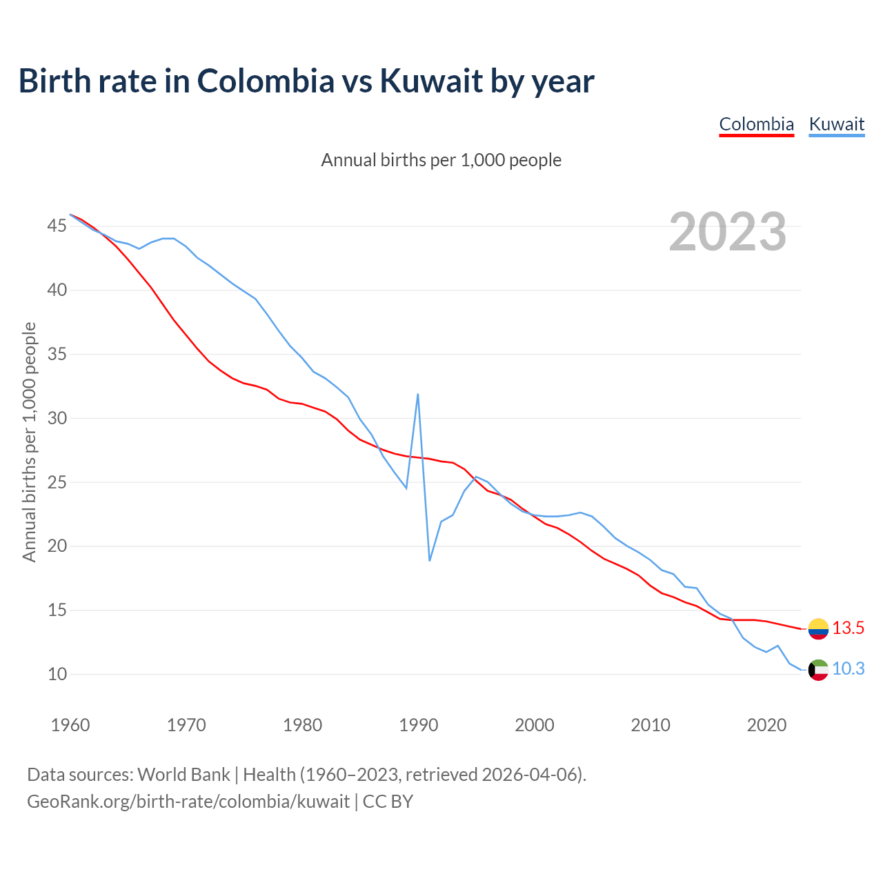 According to the latest available data on birth rates, the fertility rate in Colombia was 1.65 children per woman in 2023, compared to 1.52 in Kuwait in 2023. The replacement level is considered to be 2.1 children per woman.