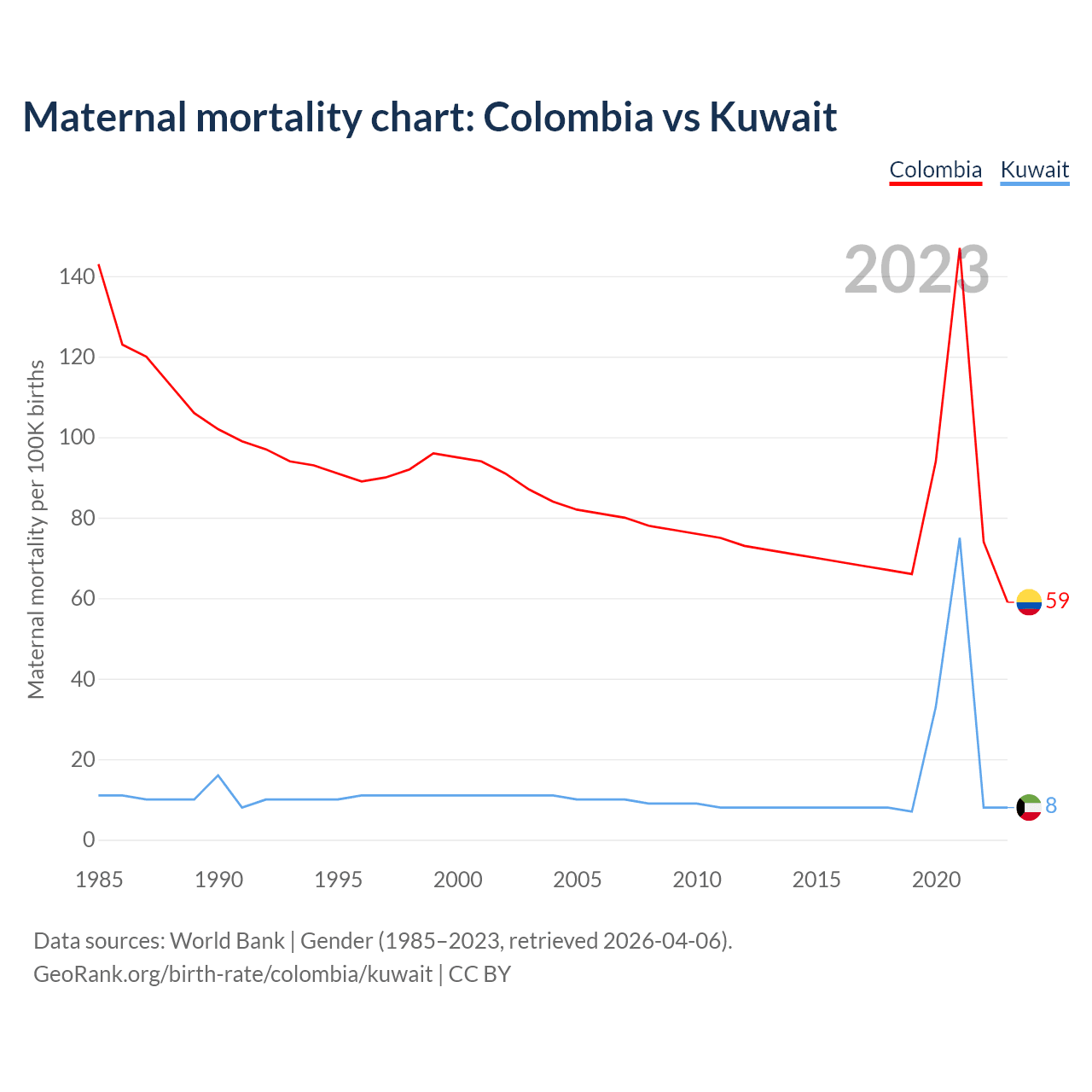 The maternal mortality rate, which is the probability of dying during childbirth or within 42 days of pregnancy termination, is 59 deaths per 100,000 live births in Colombia, compared to 8 deaths in Kuwait.