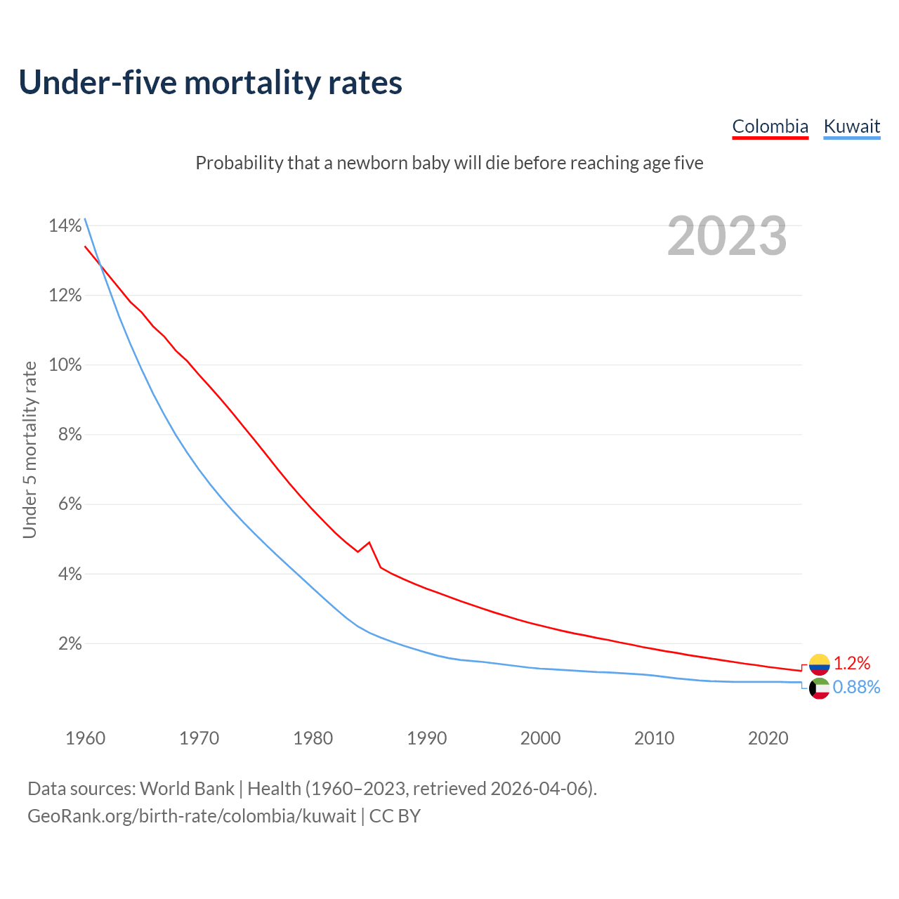 The chance that a newborn baby will die before reaching age five is 1.2% in Colombia and 0.88% in Kuwait. Above is a chart with historical data on under-five mortality rates.