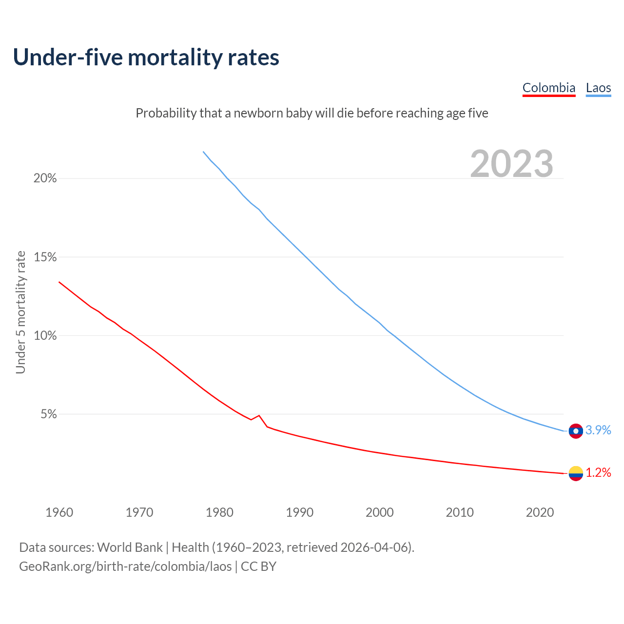 The chance that a newborn baby will die before reaching age five is 1.2% in Colombia and 3.9% in Laos. Above is a chart with historical data on under-five mortality rates.