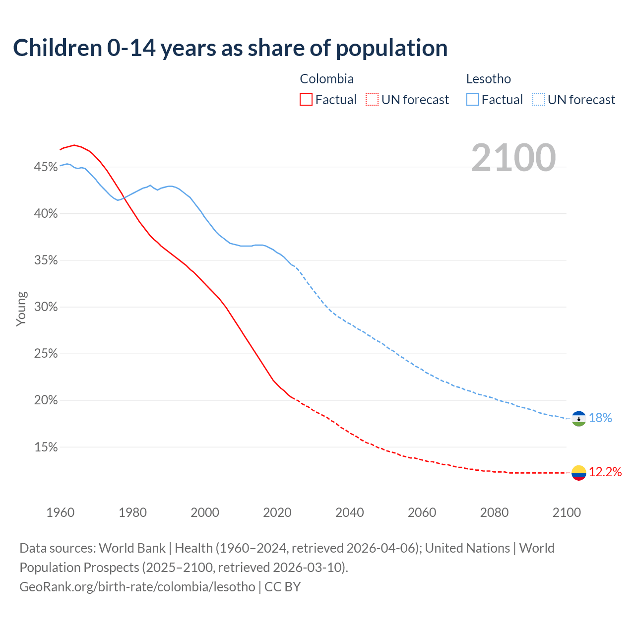 According to the latest available data on birth rates, the fertility rate in Colombia was 1.65 children per woman in 2023, compared to 2.69 in Lesotho in 2023. The replacement level is considered to be 2.1 children per woman.