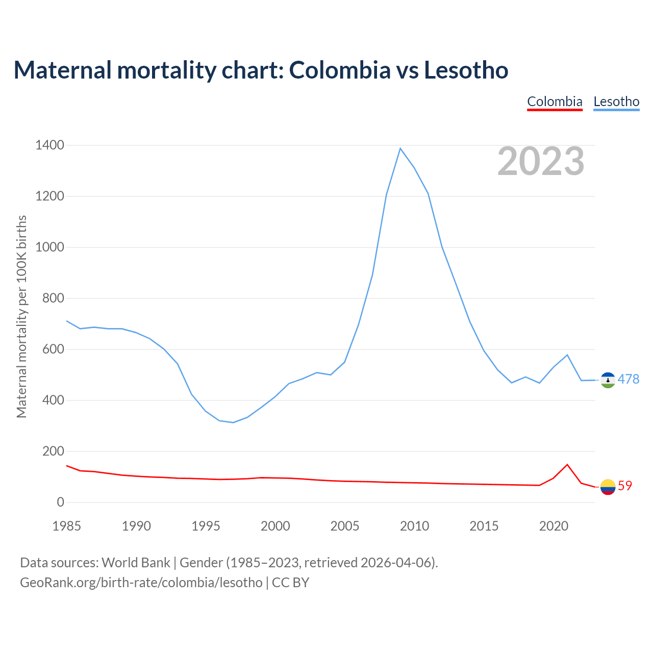 The maternal mortality rate, which is the probability of dying during childbirth or within 42 days of pregnancy termination, is 59 deaths per 100,000 live births in Colombia, compared to 478 deaths in Lesotho.