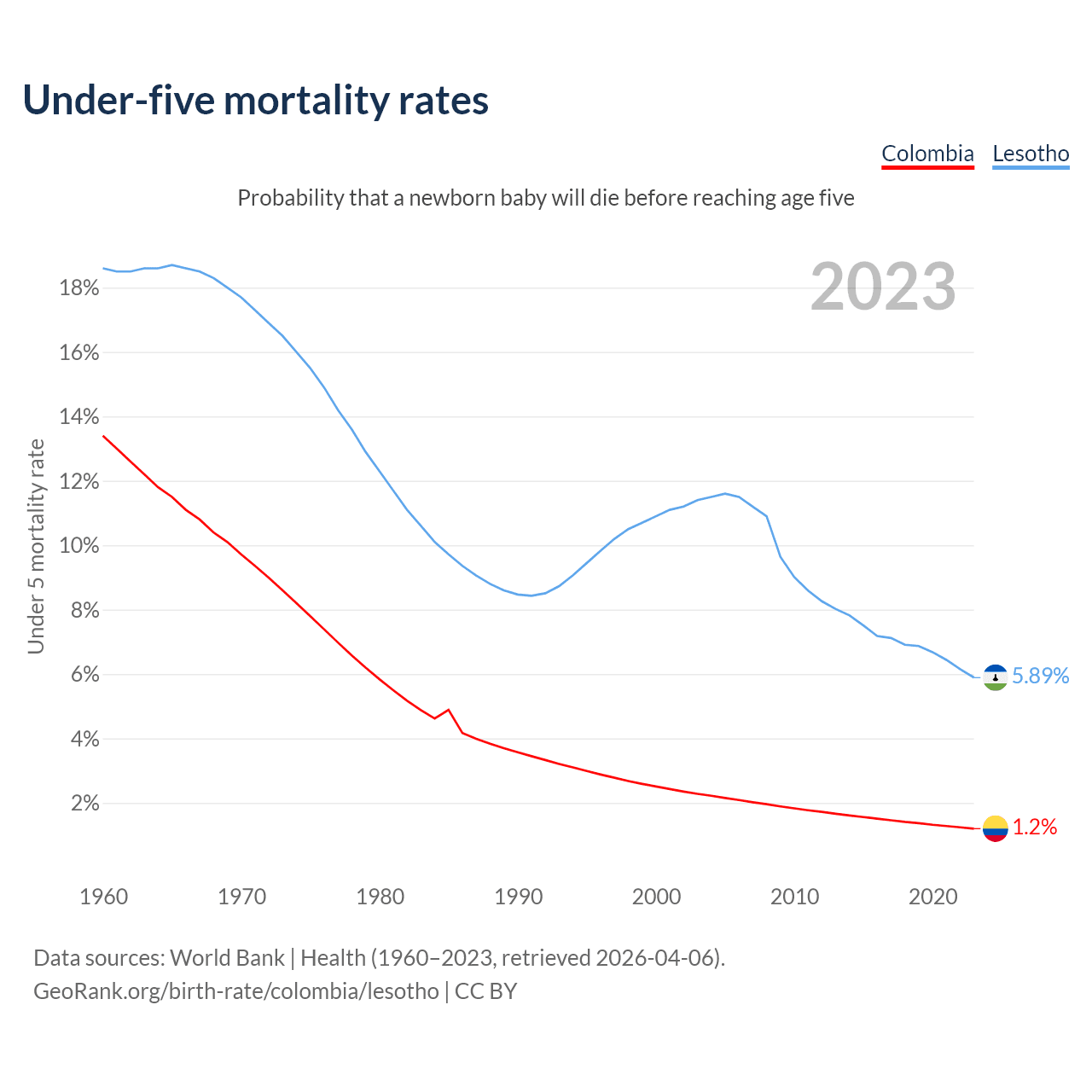 The chance that a newborn baby will die before reaching age five is 1.2% in Colombia and 5.89% in Lesotho. Above is a chart with historical data on under-five mortality rates.