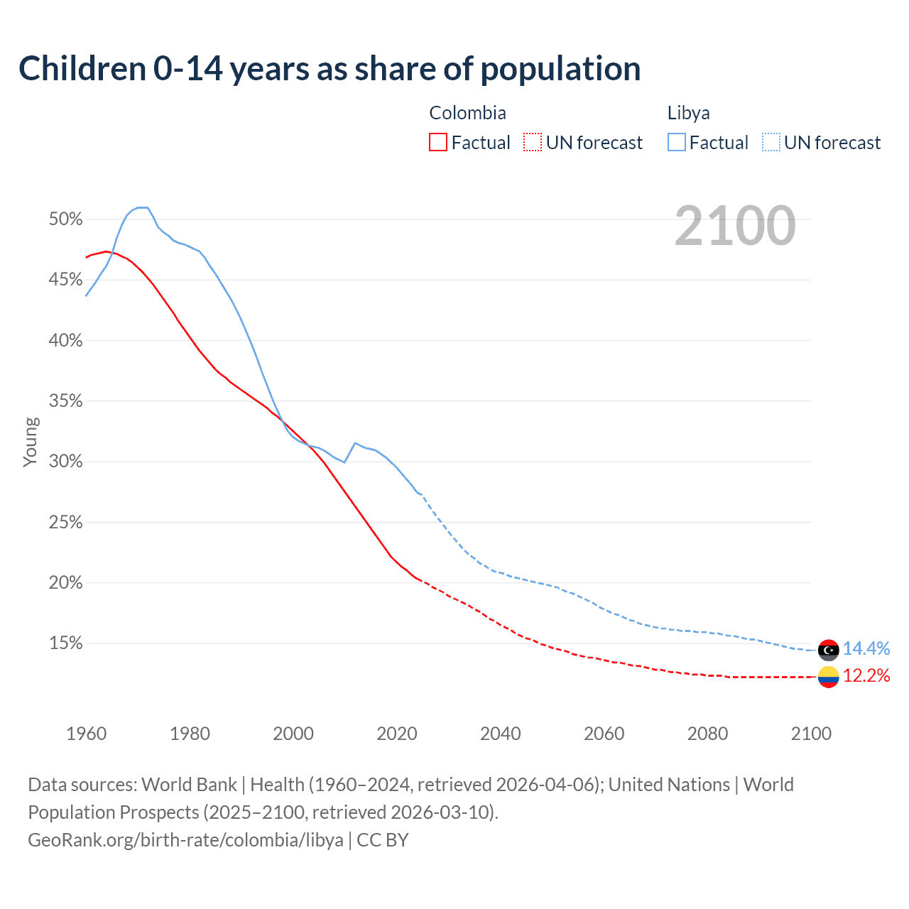 According to the latest available data on birth rates, the fertility rate in Colombia was 1.65 children per woman in 2023, compared to 2.36 in Libya in 2023. The replacement level is considered to be 2.1 children per woman.