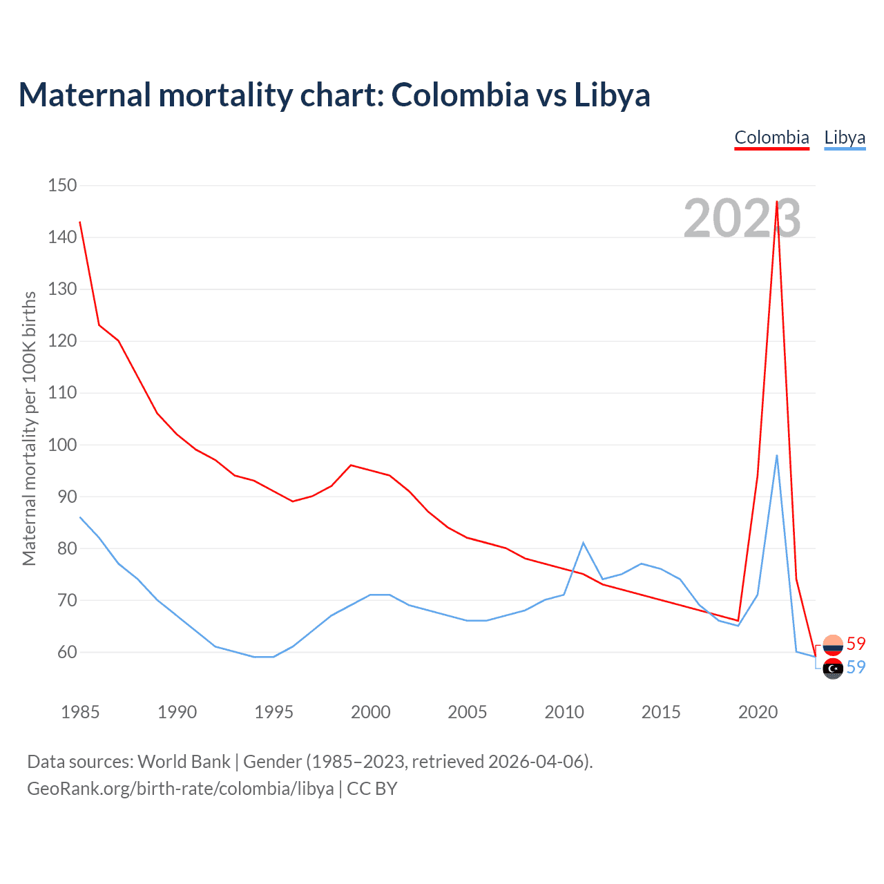 The maternal mortality rate, which is the probability of dying during childbirth or within 42 days of pregnancy termination, is 59 deaths per 100,000 live births in Colombia, compared to 59 deaths in Libya.