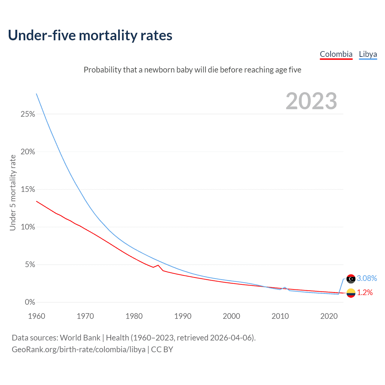 The chance that a newborn baby will die before reaching age five is 1.2% in Colombia and 3.08% in Libya. Above is a chart with historical data on under-five mortality rates.
