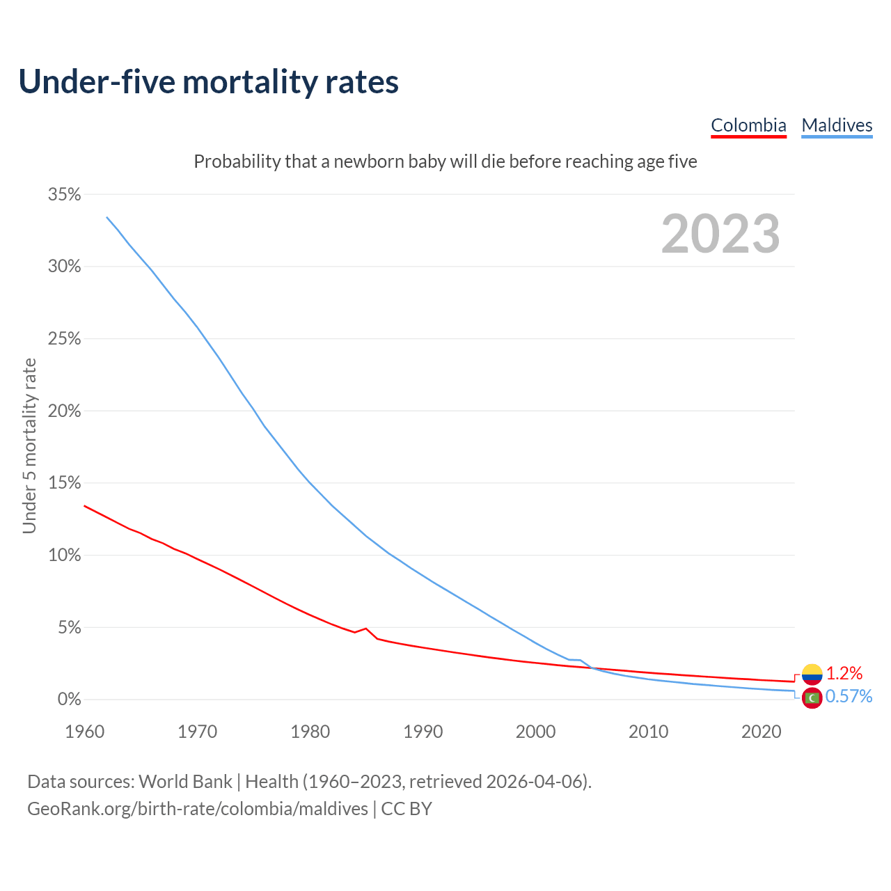 The chance that a newborn baby will die before reaching age five is 1.2% in Colombia and 0.57% in Maldives. Above is a chart with historical data on under-five mortality rates.