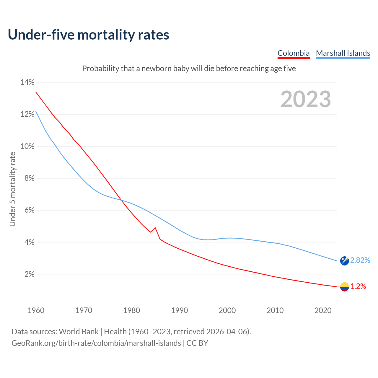 The chance that a newborn baby will die before reaching age five is 1.2% in Colombia and 2.82% in the Marshall Islands. Above is a chart with historical data on under-five mortality rates.