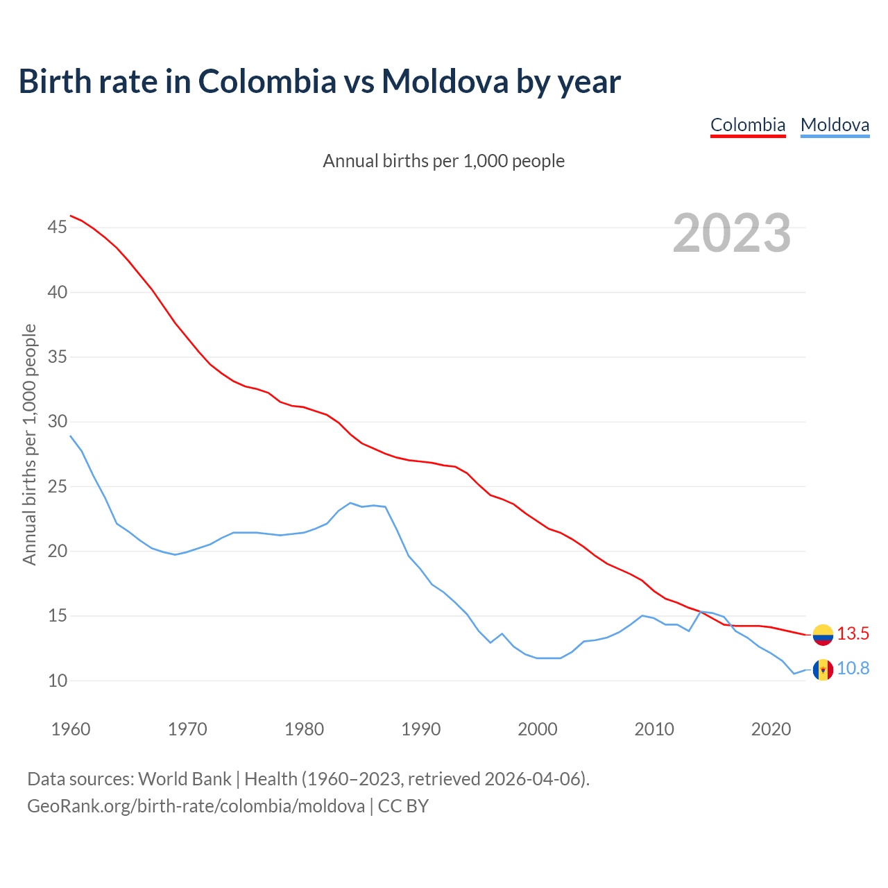 According to the latest available data on birth rates, the fertility rate in Colombia was 1.65 children per woman in 2023, compared to 1.73 in Moldova in 2023. The replacement level is considered to be 2.1 children per woman.