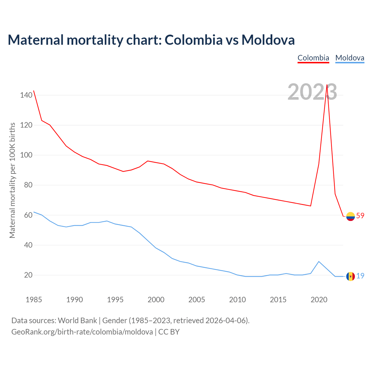 The maternal mortality rate, which is the probability of dying during childbirth or within 42 days of pregnancy termination, is 59 deaths per 100,000 live births in Colombia, compared to 19 deaths in Moldova.