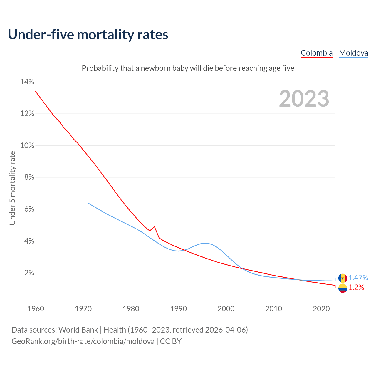 The chance that a newborn baby will die before reaching age five is 1.2% in Colombia and 1.47% in Moldova. Above is a chart with historical data on under-five mortality rates.