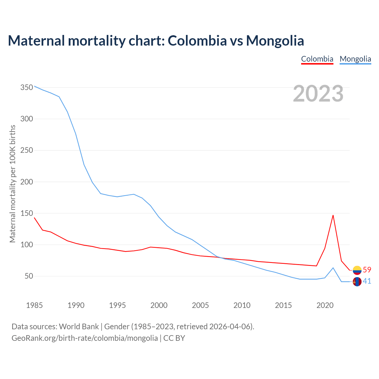 The maternal mortality rate, which is the probability of dying during childbirth or within 42 days of pregnancy termination, is 59 deaths per 100,000 live births in Colombia, compared to 41 deaths in Mongolia.