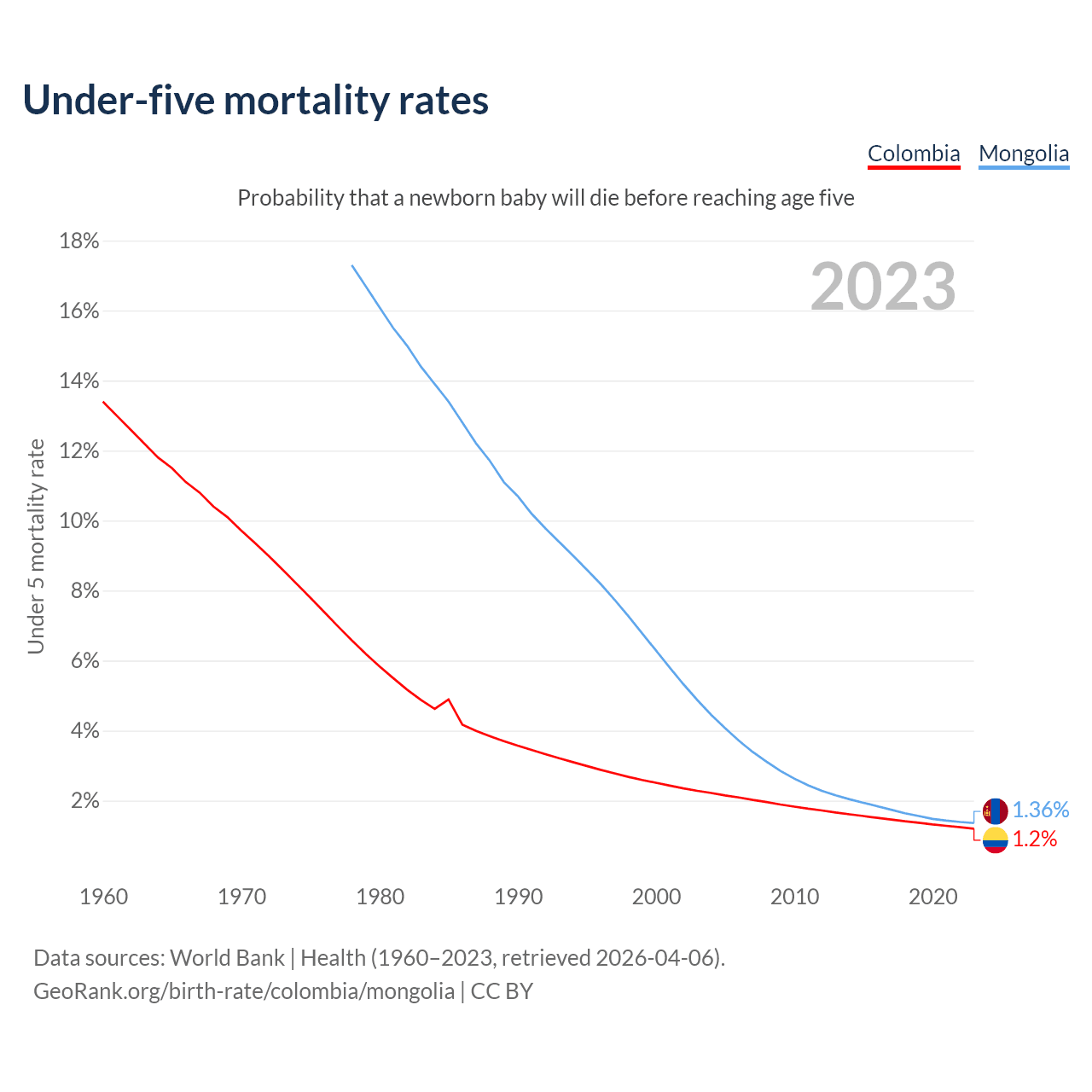 The chance that a newborn baby will die before reaching age five is 1.2% in Colombia and 1.36% in Mongolia. Above is a chart with historical data on under-five mortality rates.