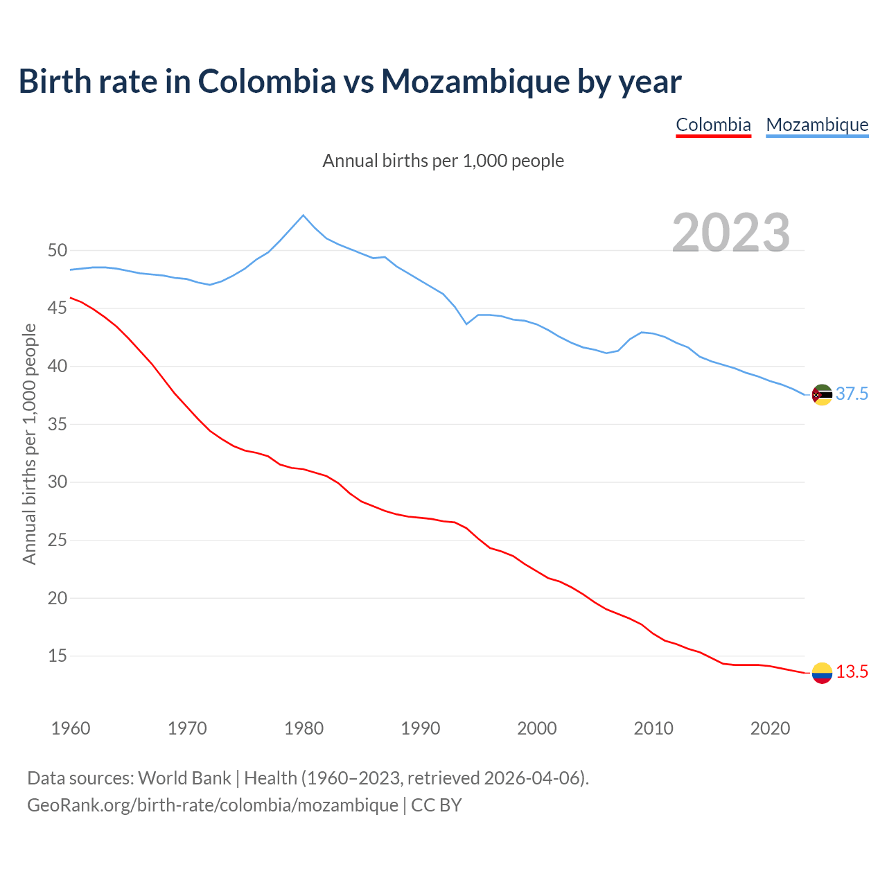 Colombia has an annual birth rate of 13.5 births per 1,000 people, compared to 37.5 for Mozambique. The average number of children a woman is expected to have during her lifetime — the fertility rate, is 1.65 in Colombia and 4.76 in Mozambique — 189.5% difference.