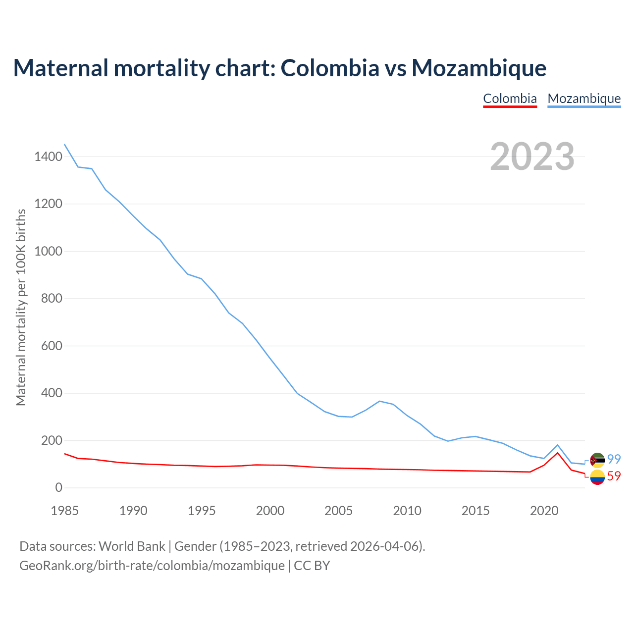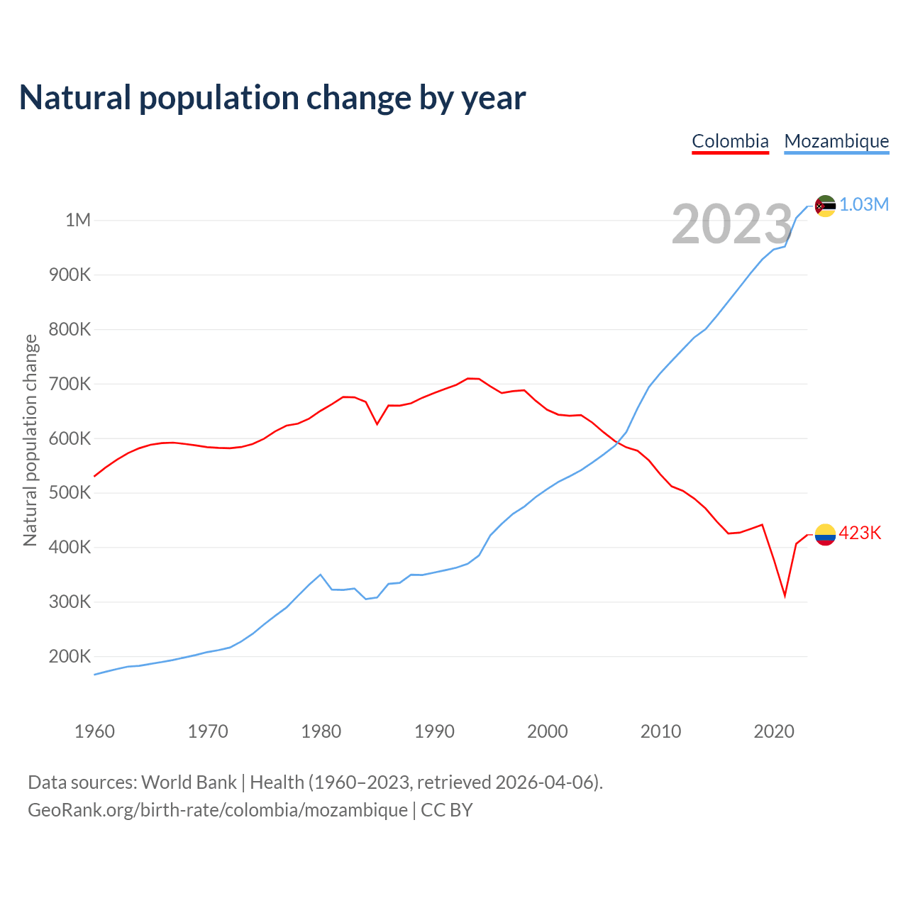 According to the latest available data on birth rates, the fertility rate in Colombia was 1.65 children per woman in 2023, compared to 4.76 in Mozambique in 2023. The replacement level is considered to be 2.1 children per woman.