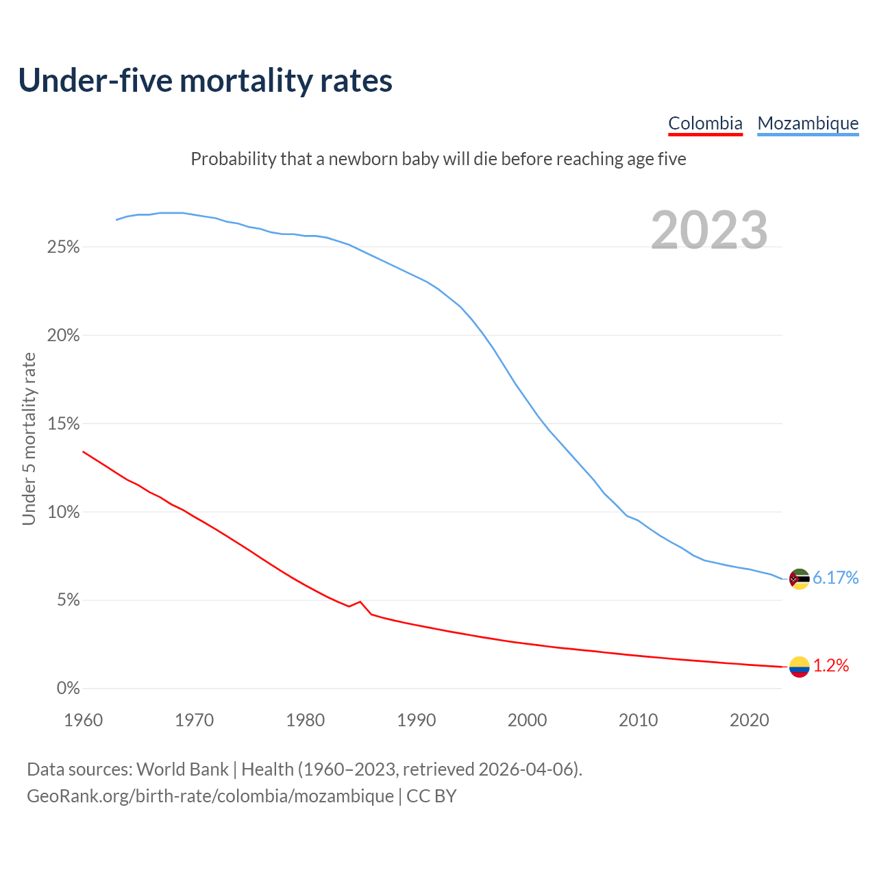 The chance that a newborn baby will die before reaching age five is 1.2% in Colombia and 6.17% in Mozambique. Above is a chart with historical data on under-five mortality rates.
