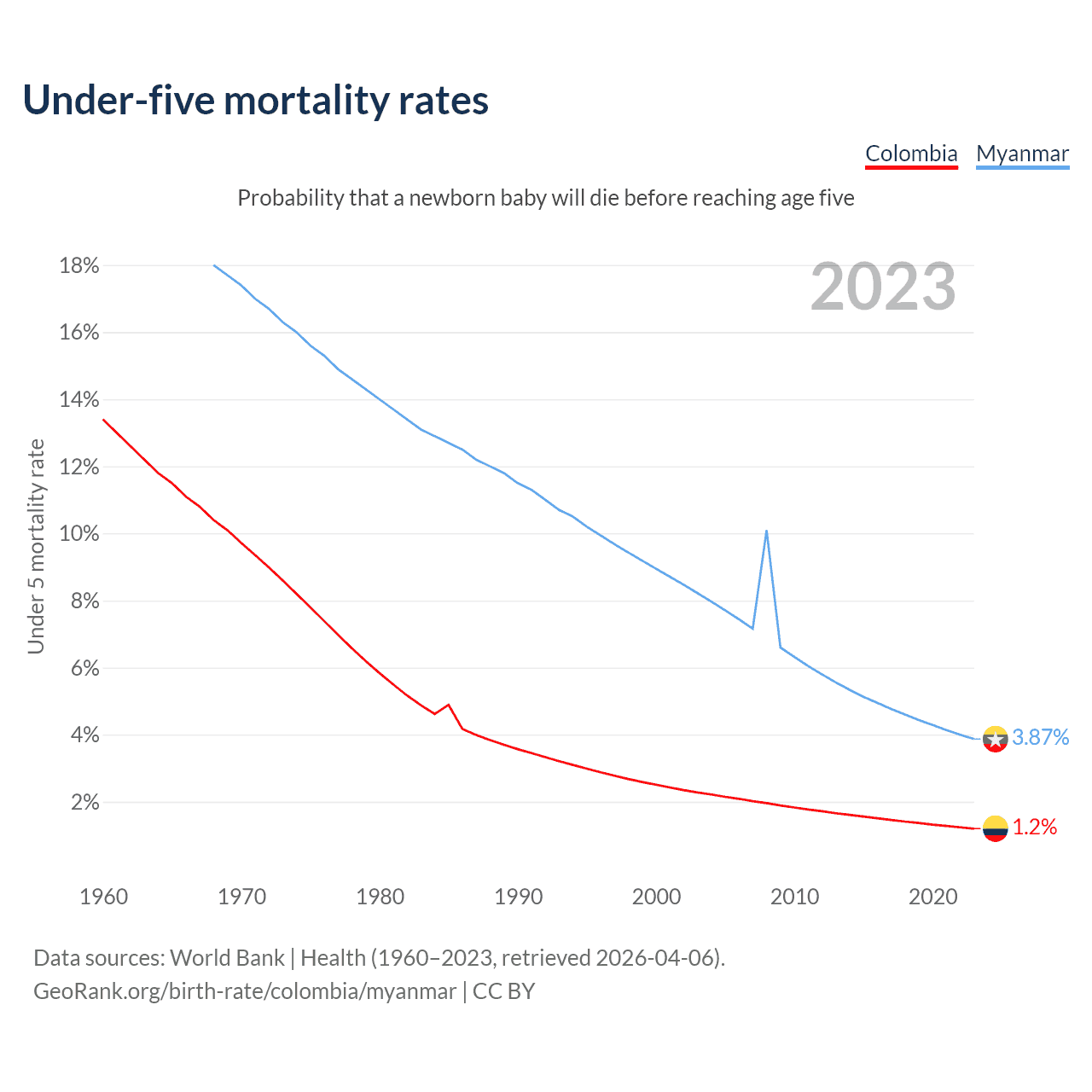The chance that a newborn baby will die before reaching age five is 1.2% in Colombia and 3.87% in Myanmar. Above is a chart with historical data on under-five mortality rates.