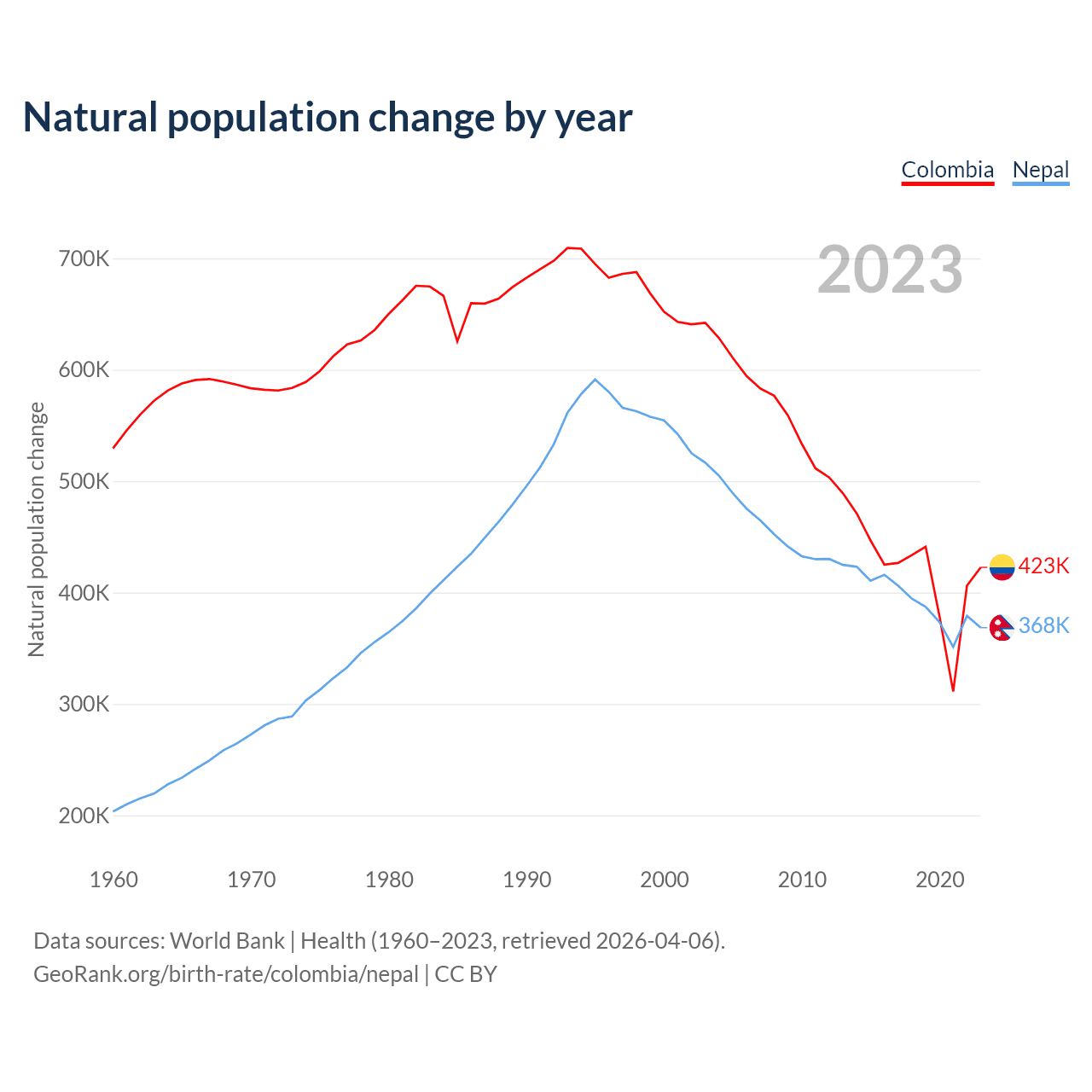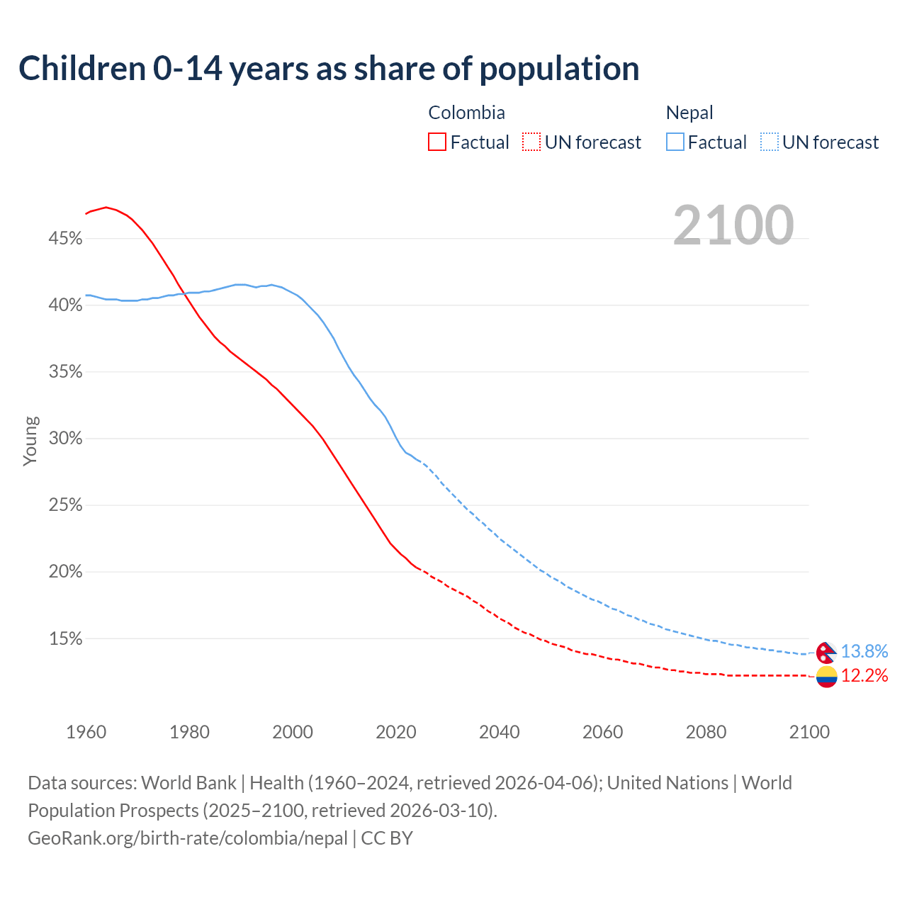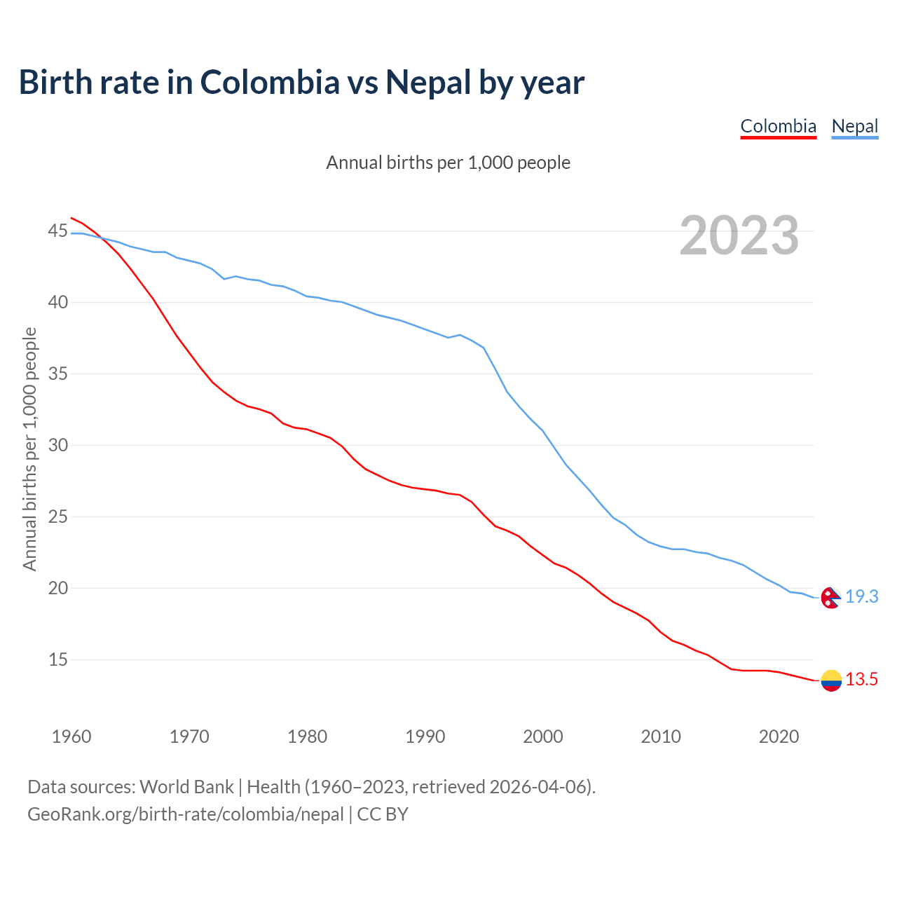 Colombia has an annual birth rate of 13.5 births per 1,000 people, compared to 19.3 for Nepal. The average number of children a woman is expected to have during her lifetime — the fertility rate, is 1.65 in Colombia and 1.98 in Nepal — 20.6% difference.