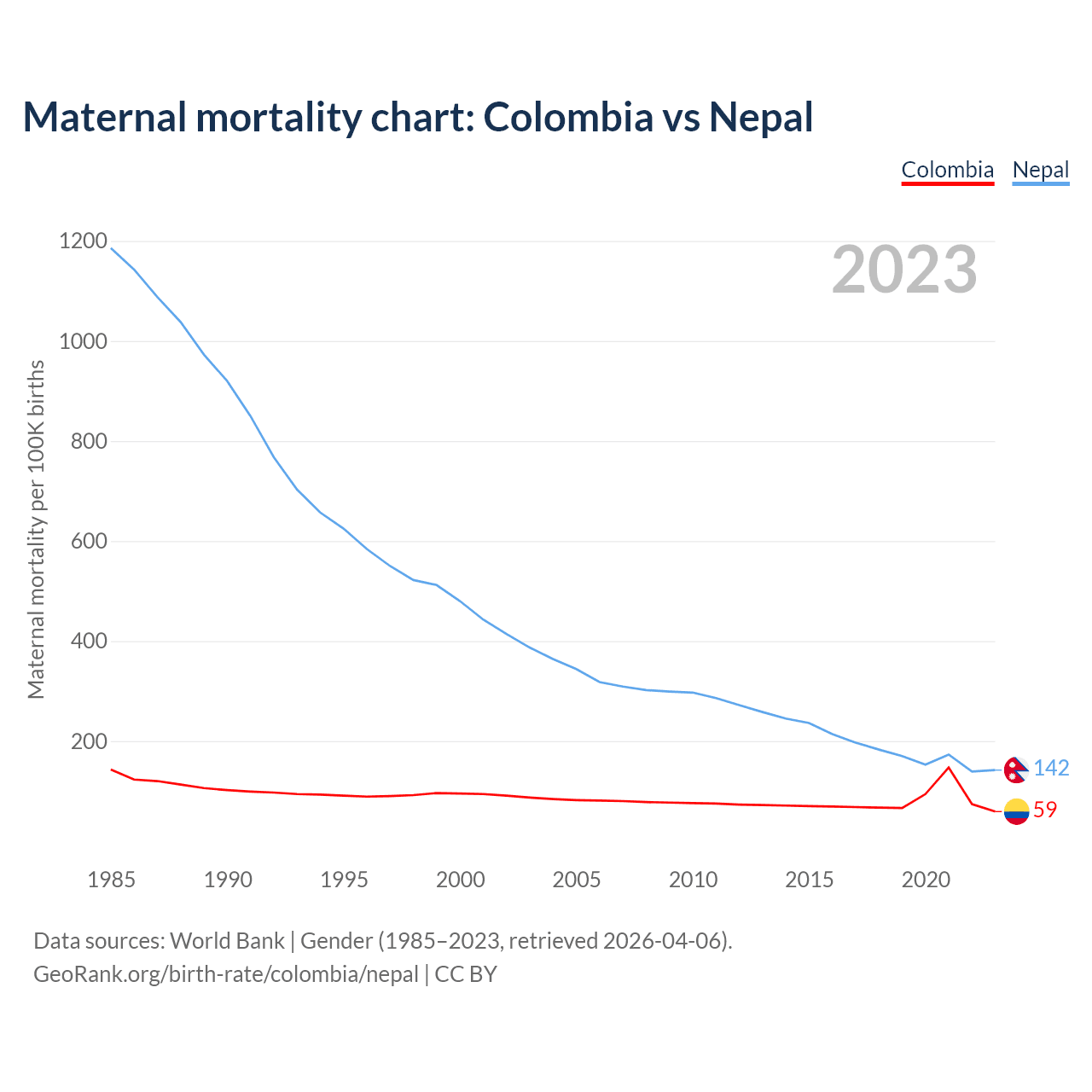 The maternal mortality rate, which is the probability of dying during childbirth or within 42 days of pregnancy termination, is 59 deaths per 100,000 live births in Colombia, compared to 142 deaths in Nepal.