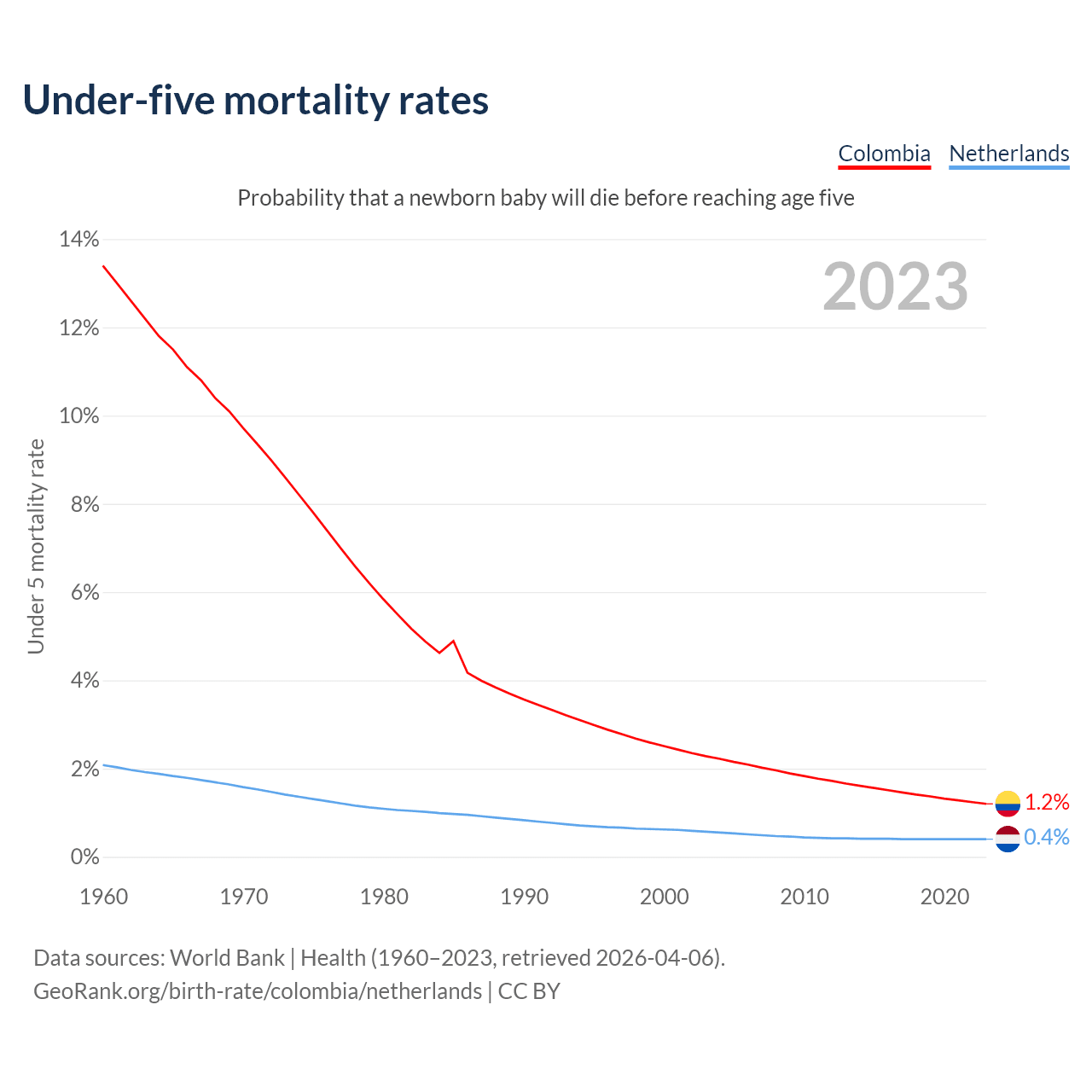 The chance that a newborn baby will die before reaching age five is 1.2% in Colombia and 0.4% in the Netherlands. Above is a chart with historical data on under-five mortality rates.