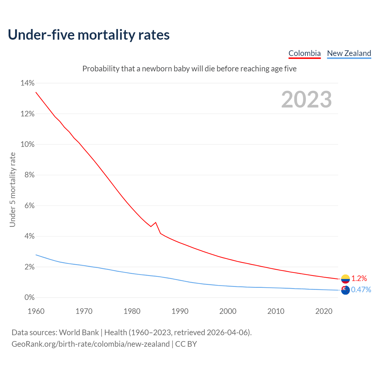 The chance that a newborn baby will die before reaching age five is 1.2% in Colombia and 0.47% in New Zealand. Above is a chart with historical data on under-five mortality rates.