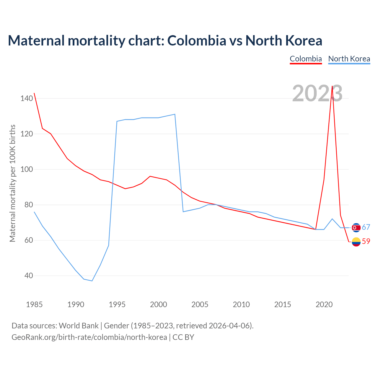 The maternal mortality rate, which is the probability of dying during childbirth or within 42 days of pregnancy termination, is 59 deaths per 100,000 live births in Colombia, compared to 67 deaths in North Korea.