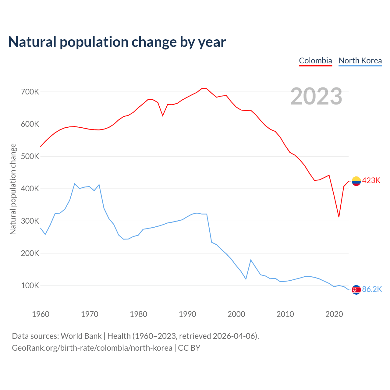 According to the latest available data on birth rates, the fertility rate in Colombia was 1.65 children per woman in 2023, compared to 1.78 in North Korea in 2023. The replacement level is considered to be 2.1 children per woman.