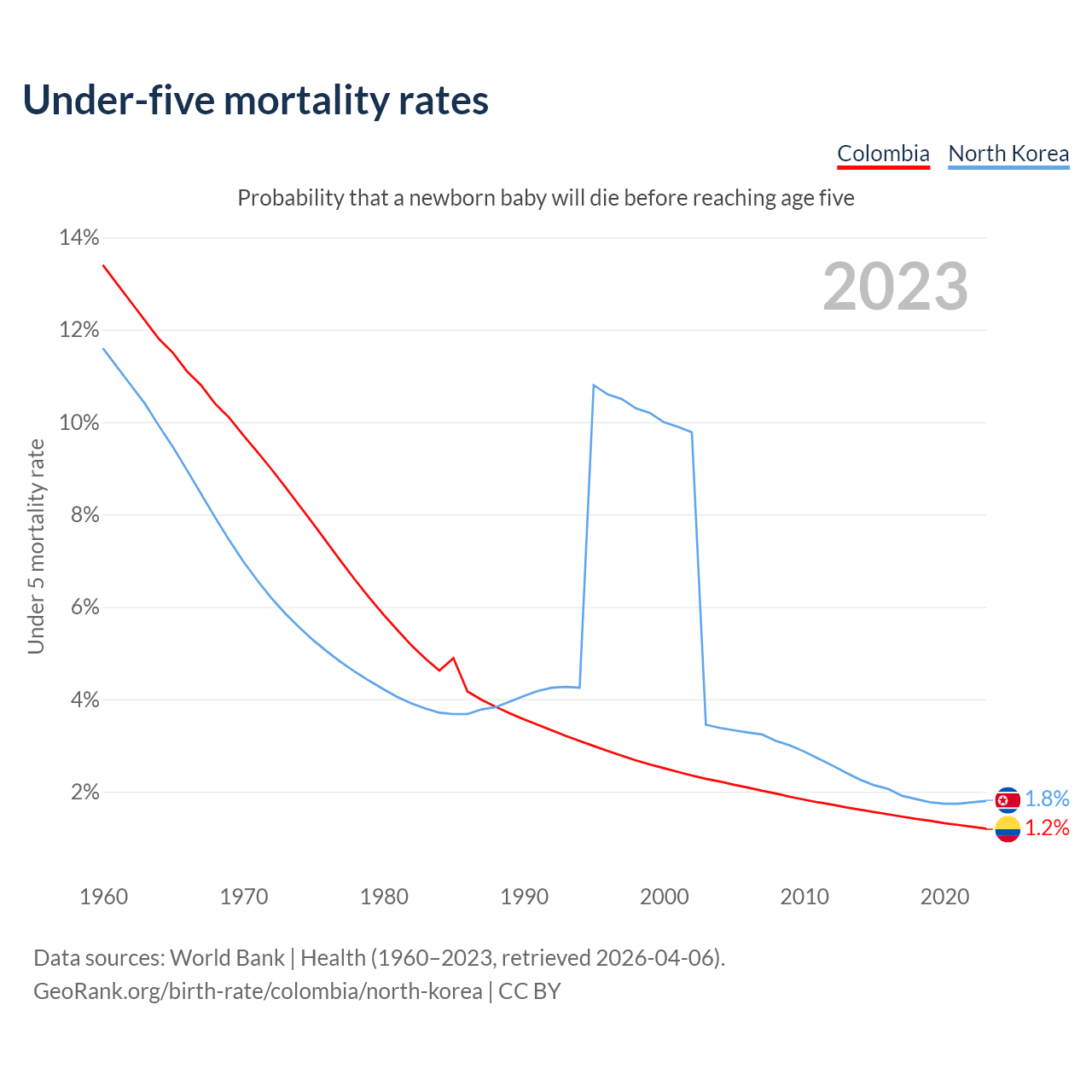 The chance that a newborn baby will die before reaching age five is 1.2% in Colombia and 1.8% in North Korea. Above is a chart with historical data on under-five mortality rates.