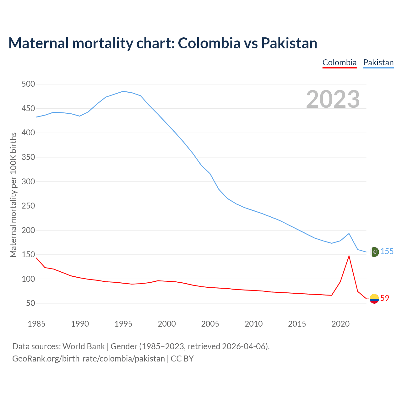 The maternal mortality rate, which is the probability of dying during childbirth or within 42 days of pregnancy termination, is 59 deaths per 100,000 live births in Colombia, compared to 155 deaths in Pakistan.