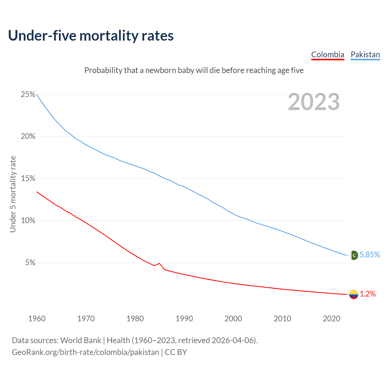 The chance that a newborn baby will die before reaching age five is 1.2% in Colombia and 5.85% in Pakistan. Above is a chart with historical data on under-five mortality rates.