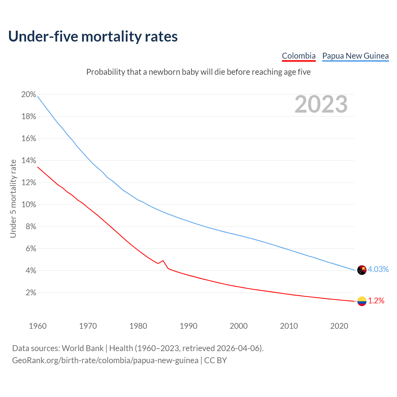 The chance that a newborn baby will die before reaching age five is 1.2% in Colombia and 4.03% in Papua New Guinea. Above is a chart with historical data on under-five mortality rates.