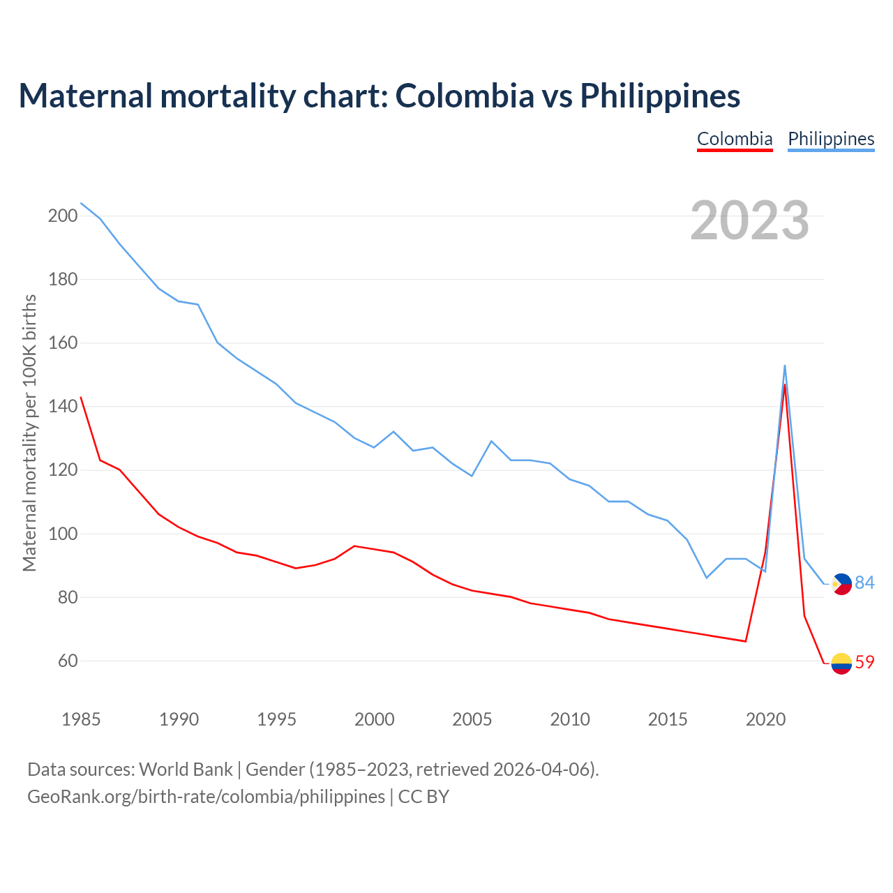 The maternal mortality rate, which is the probability of dying during childbirth or within 42 days of pregnancy termination, is 59 deaths per 100,000 live births in Colombia, compared to 84 deaths in the Philippines.