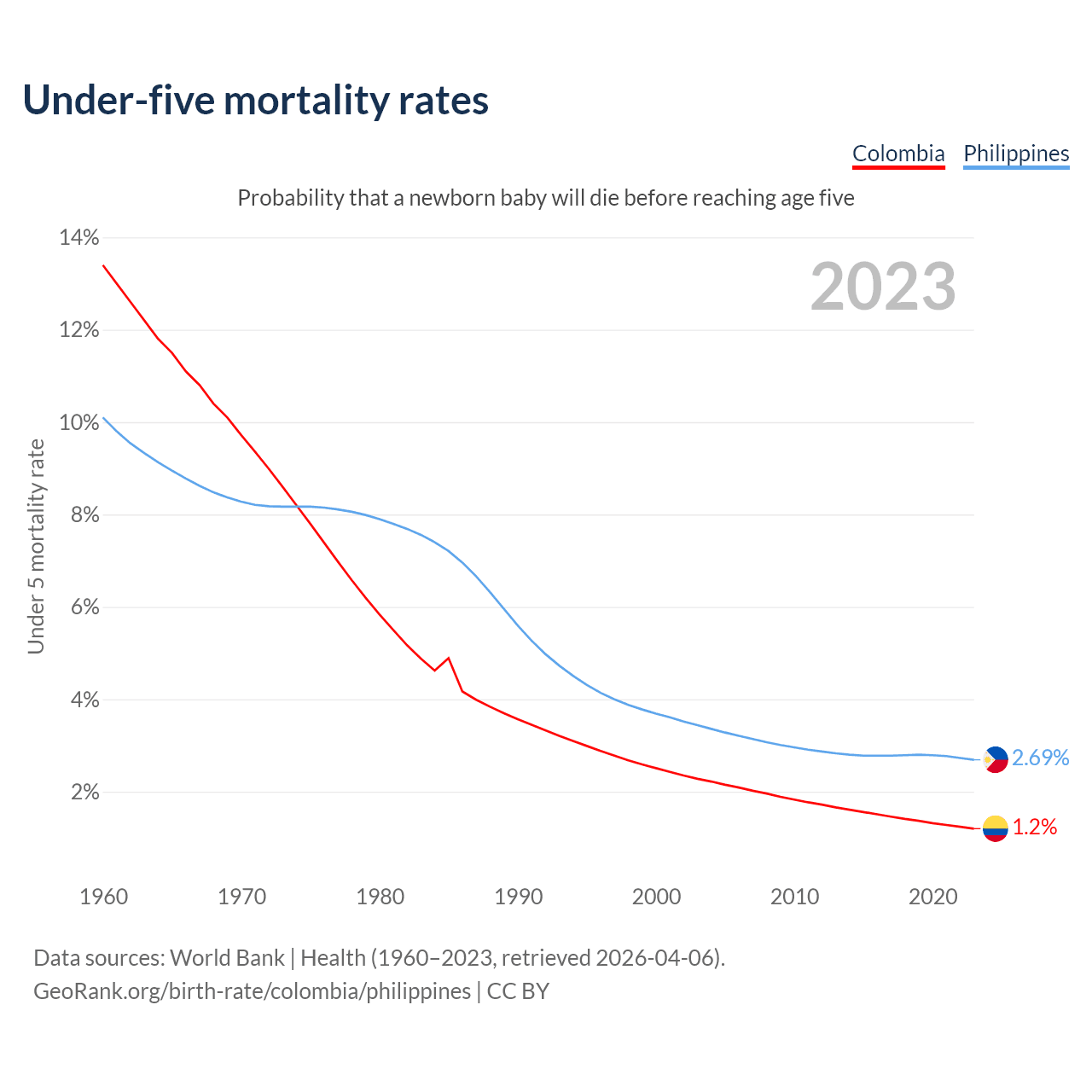 The chance that a newborn baby will die before reaching age five is 1.2% in Colombia and 2.69% in the Philippines. Above is a chart with historical data on under-five mortality rates.