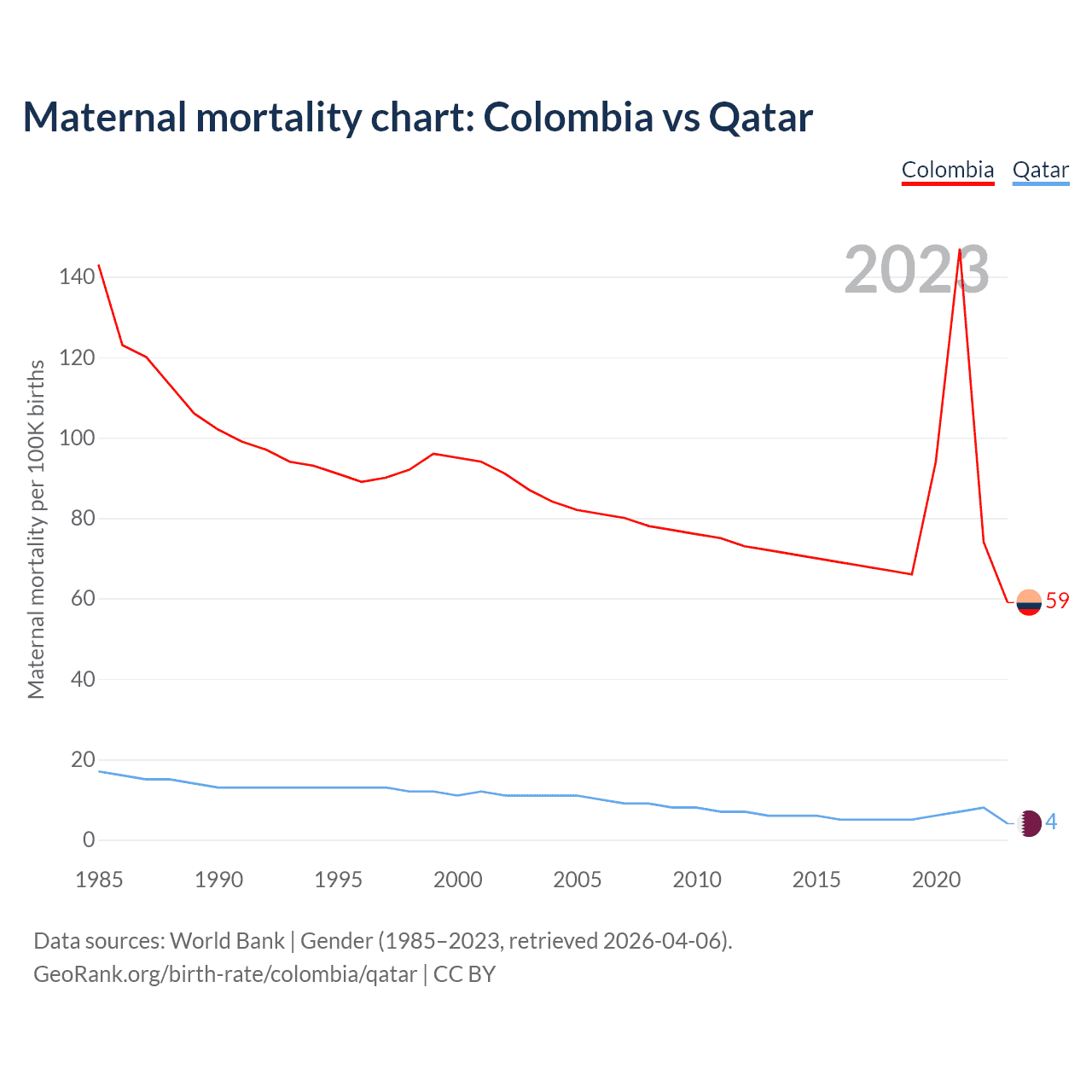 The maternal mortality rate, which is the probability of dying during childbirth or within 42 days of pregnancy termination, is 59 deaths per 100,000 live births in Colombia, compared to 4 deaths in Qatar.