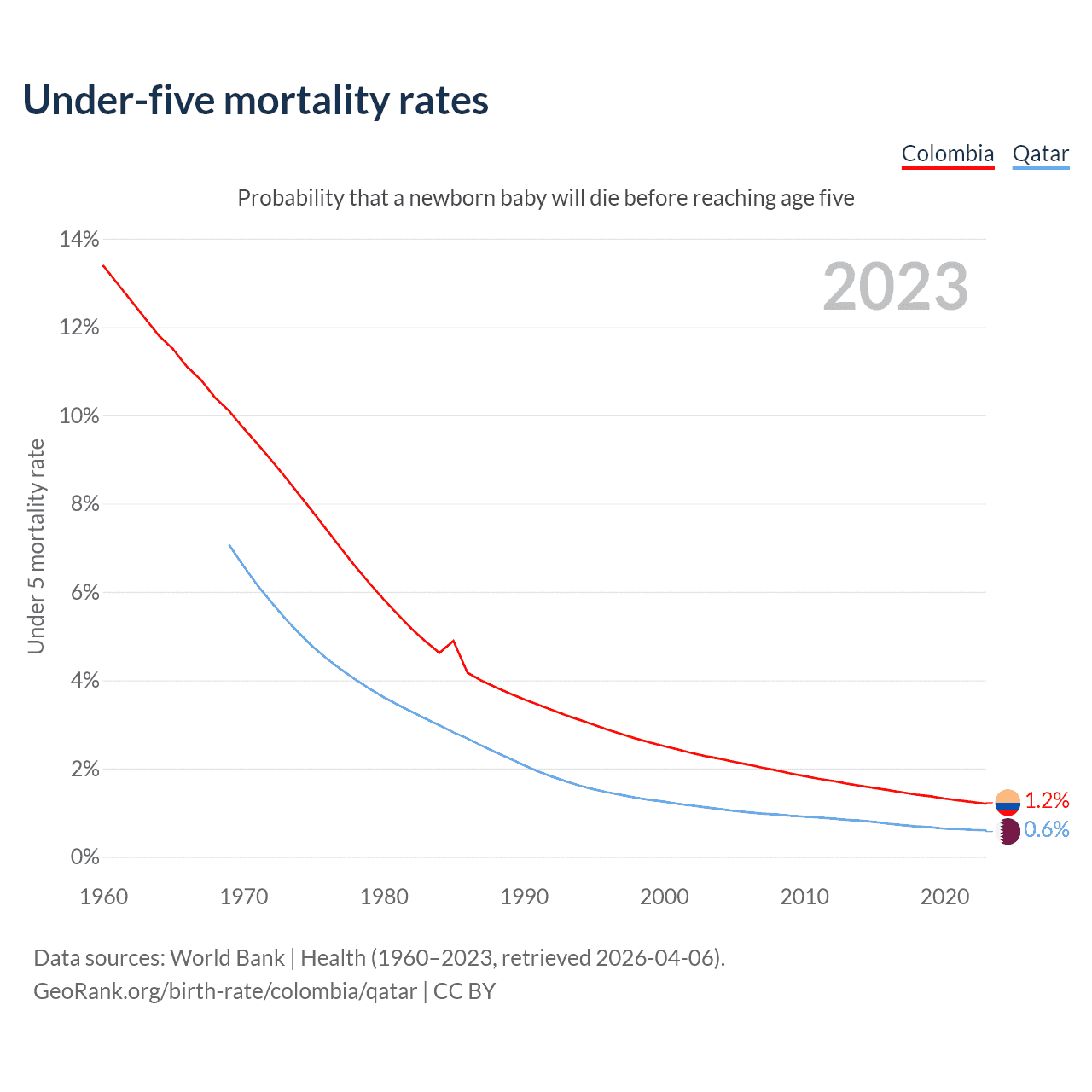 The chance that a newborn baby will die before reaching age five is 1.2% in Colombia and 0.6% in Qatar. Above is a chart with historical data on under-five mortality rates.