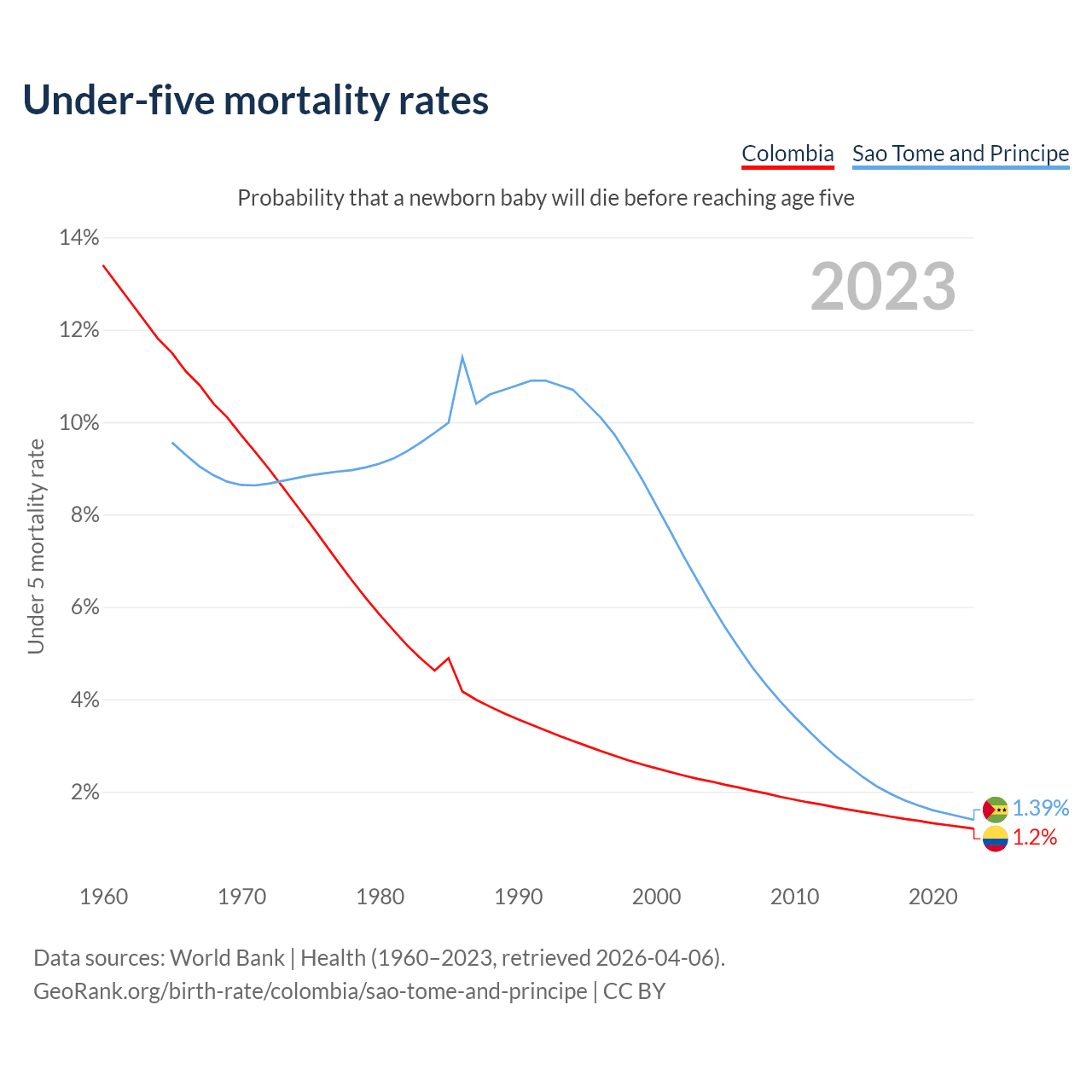 The chance that a newborn baby will die before reaching age five is 1.2% in Colombia and 1.39% in Sao Tome and Principe. Above is a chart with historical data on under-five mortality rates.