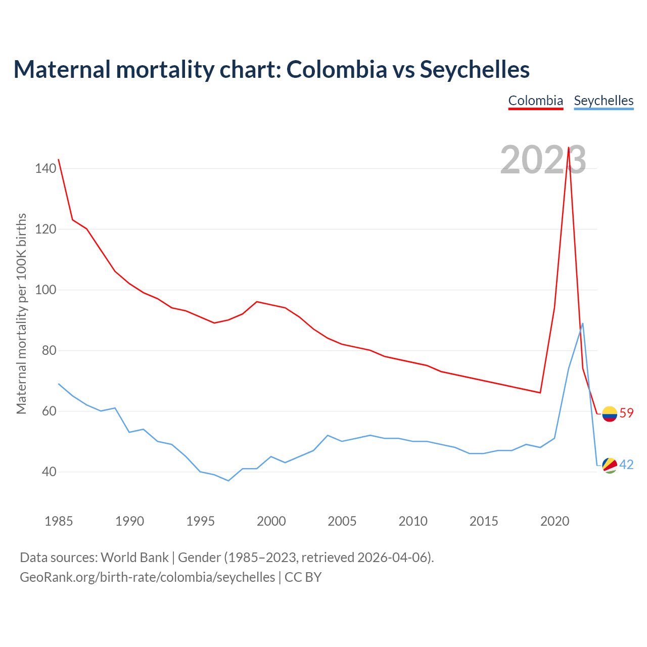 The maternal mortality rate, which is the probability of dying during childbirth or within 42 days of pregnancy termination, is 59 deaths per 100,000 live births in Colombia, compared to 42 deaths in the Seychelles.
