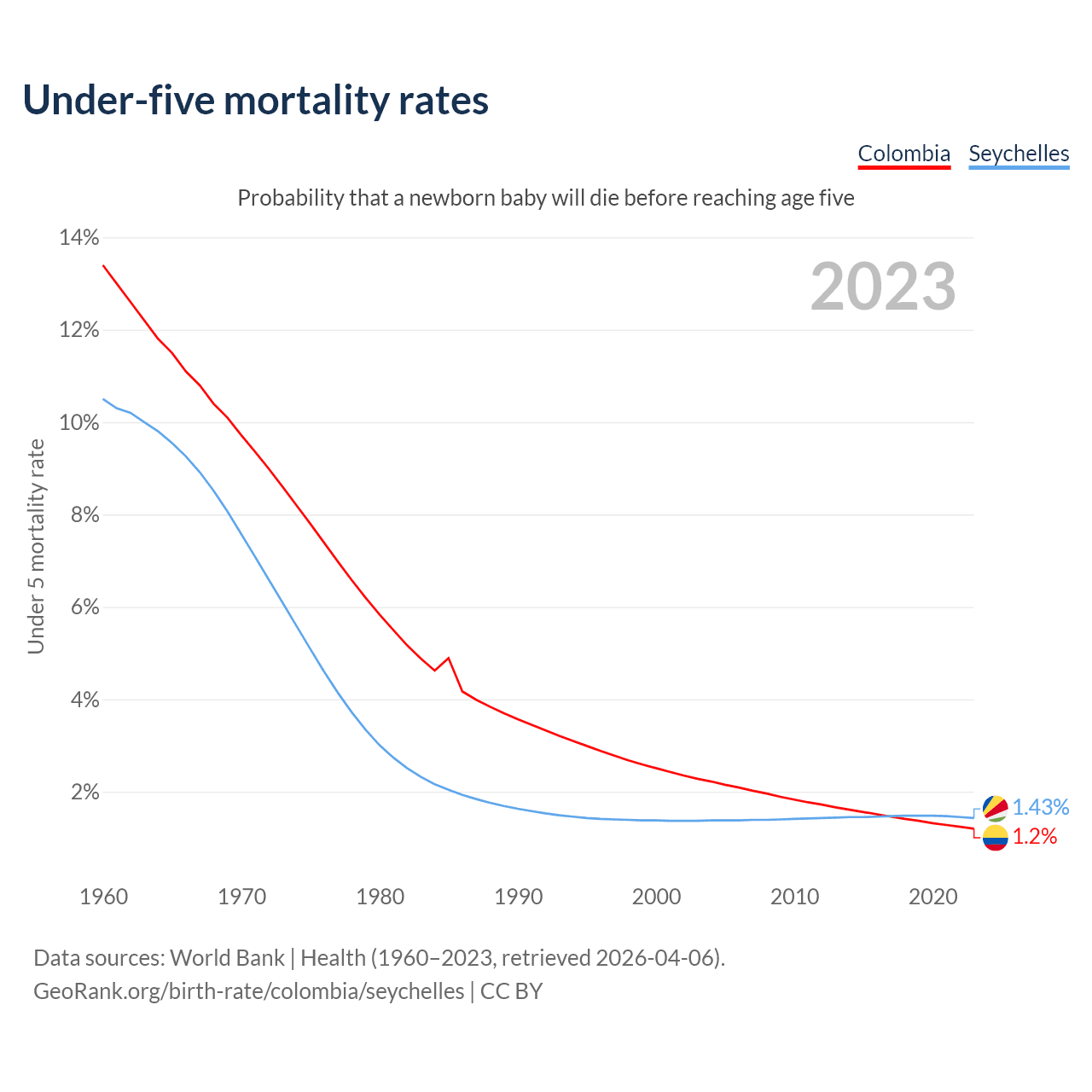 The chance that a newborn baby will die before reaching age five is 1.2% in Colombia and 1.43% in the Seychelles. Above is a chart with historical data on under-five mortality rates.