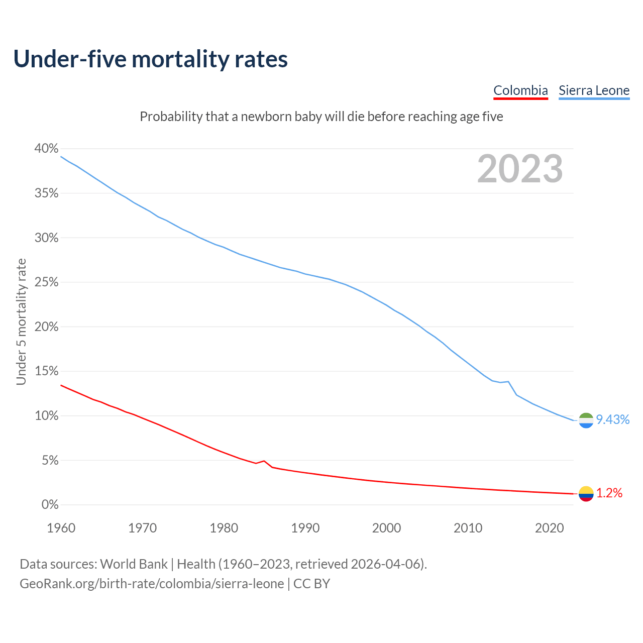 The chance that a newborn baby will die before reaching age five is 1.2% in Colombia and 9.43% in Sierra Leone. Above is a chart with historical data on under-five mortality rates.