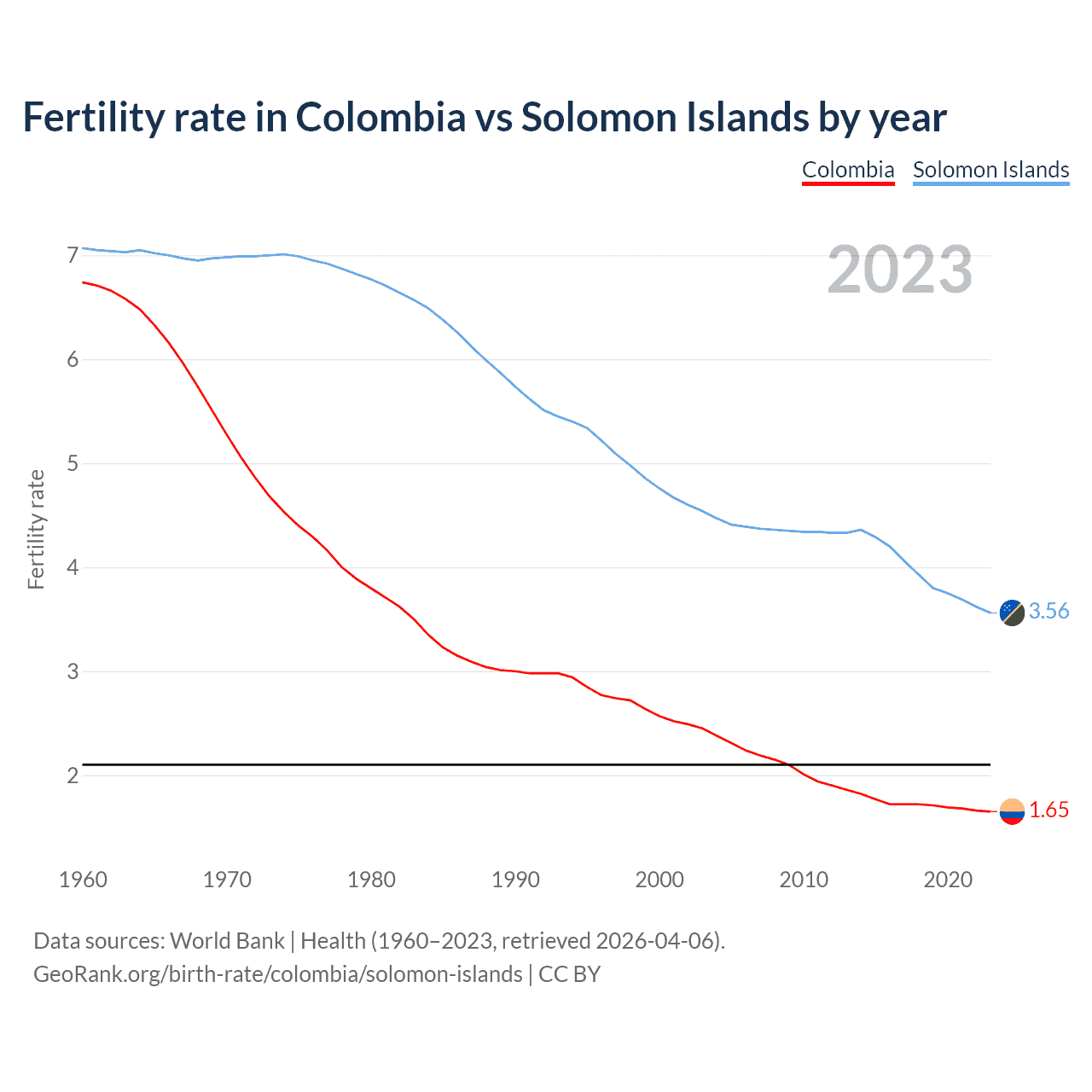 Fertility rate in Colombia vs Solomon Islands by year
