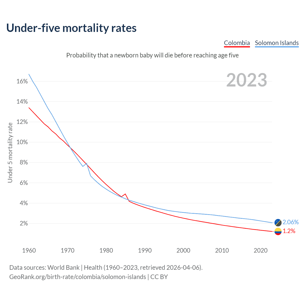 The chance that a newborn baby will die before reaching age five is 1.2% in Colombia and 2.06% in the Solomon Islands. Above is a chart with historical data on under-five mortality rates.