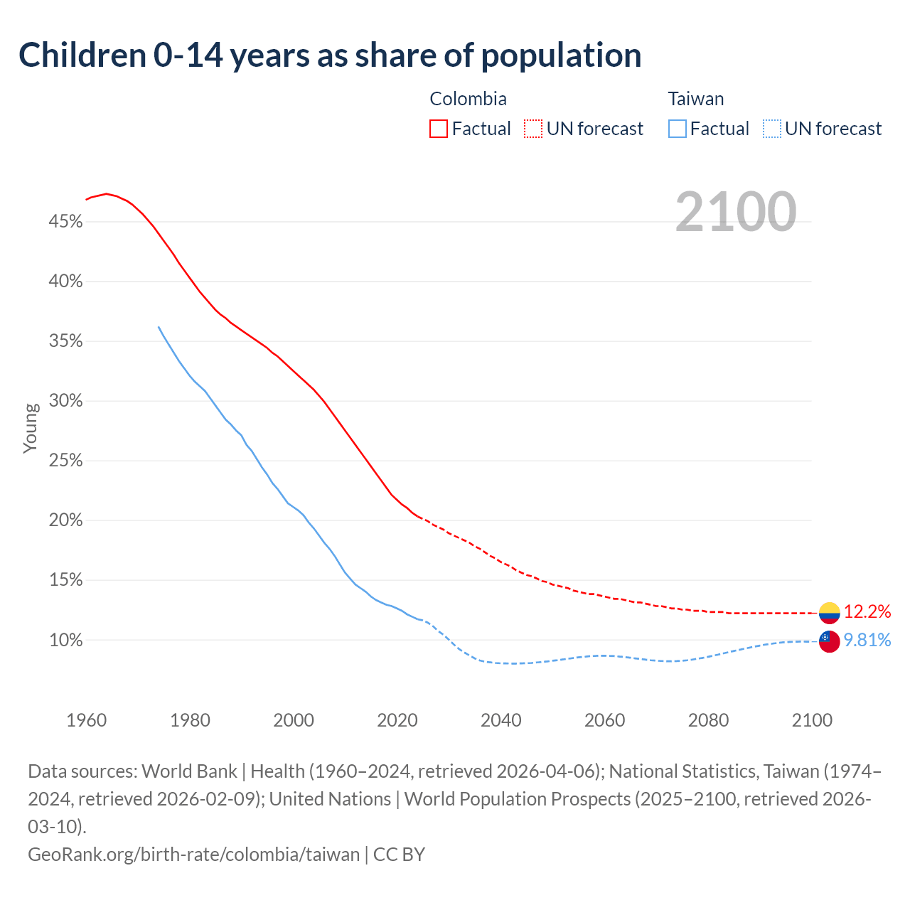 Data sources: World Bank | Health (1960–2024, retrieved 2026-04-06); National Statistics, Taiwan (1974–2024, retrieved 2026-02-09); United Nations | World Population Prospects (2025–2100, retrieved 2026-03-10).