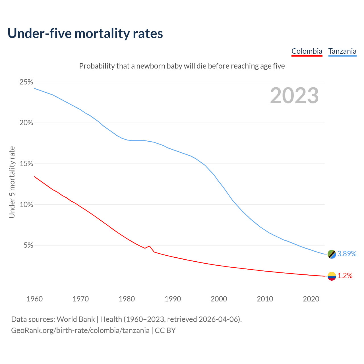 The chance that a newborn baby will die before reaching age five is 1.2% in Colombia and 3.89% in Tanzania. Above is a chart with historical data on under-five mortality rates.