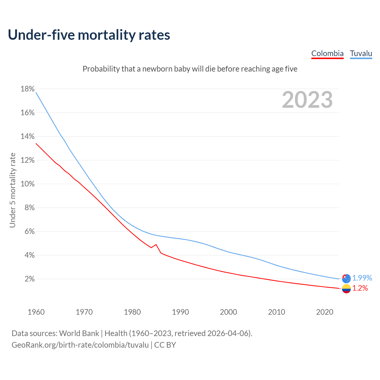The chance that a newborn baby will die before reaching age five is 1.2% in Colombia and 1.99% in Tuvalu. Above is a chart with historical data on under-five mortality rates.