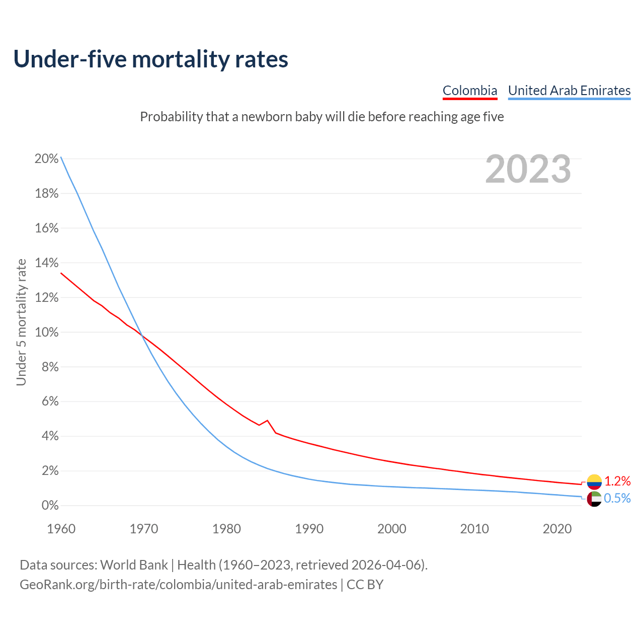 The chance that a newborn baby will die before reaching age five is 1.2% in Colombia and 0.5% in the United Arab Emirates. Above is a chart with historical data on under-five mortality rates.