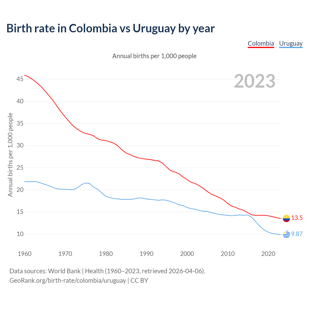 According to the latest available data on birth rates, the fertility rate in Colombia was 1.65 children per woman in 2023, compared to 1.41 in Uruguay in 2023. The replacement level is considered to be 2.1 children per woman.