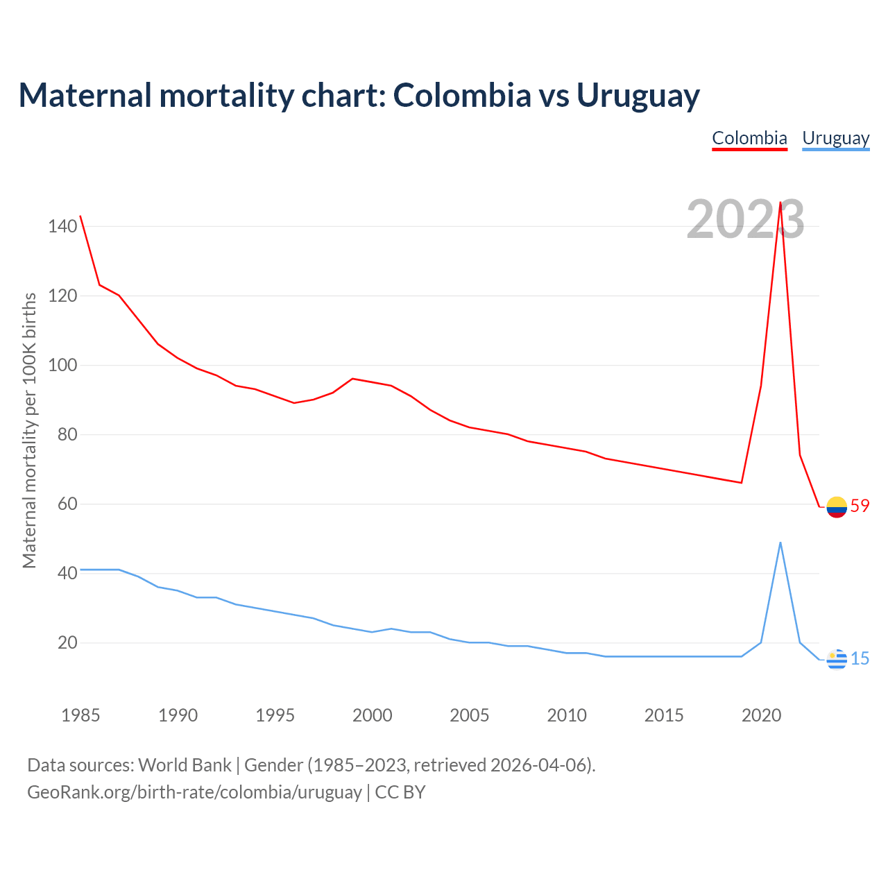 The maternal mortality rate, which is the probability of dying during childbirth or within 42 days of pregnancy termination, is 59 deaths per 100,000 live births in Colombia, compared to 15 deaths in Uruguay.