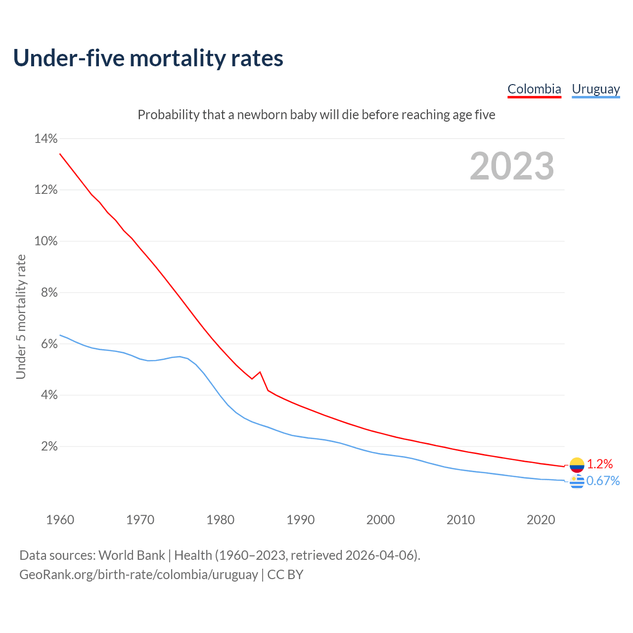 The chance that a newborn baby will die before reaching age five is 1.2% in Colombia and 0.67% in Uruguay. Above is a chart with historical data on under-five mortality rates.